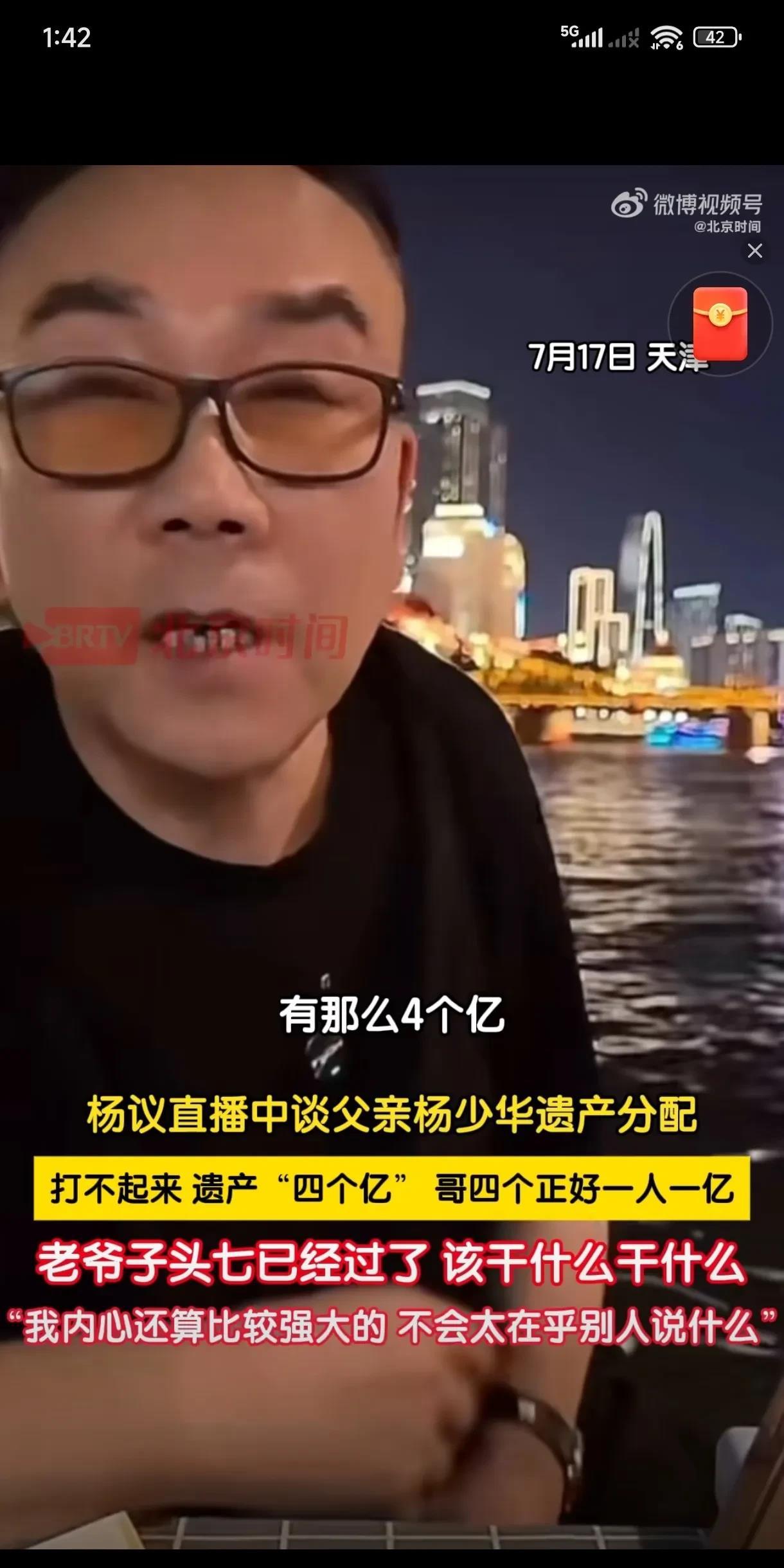 杨少华老爷子竟然给他的儿子们留了4个亿! 今天杨议在直播的时候说,老爷子给