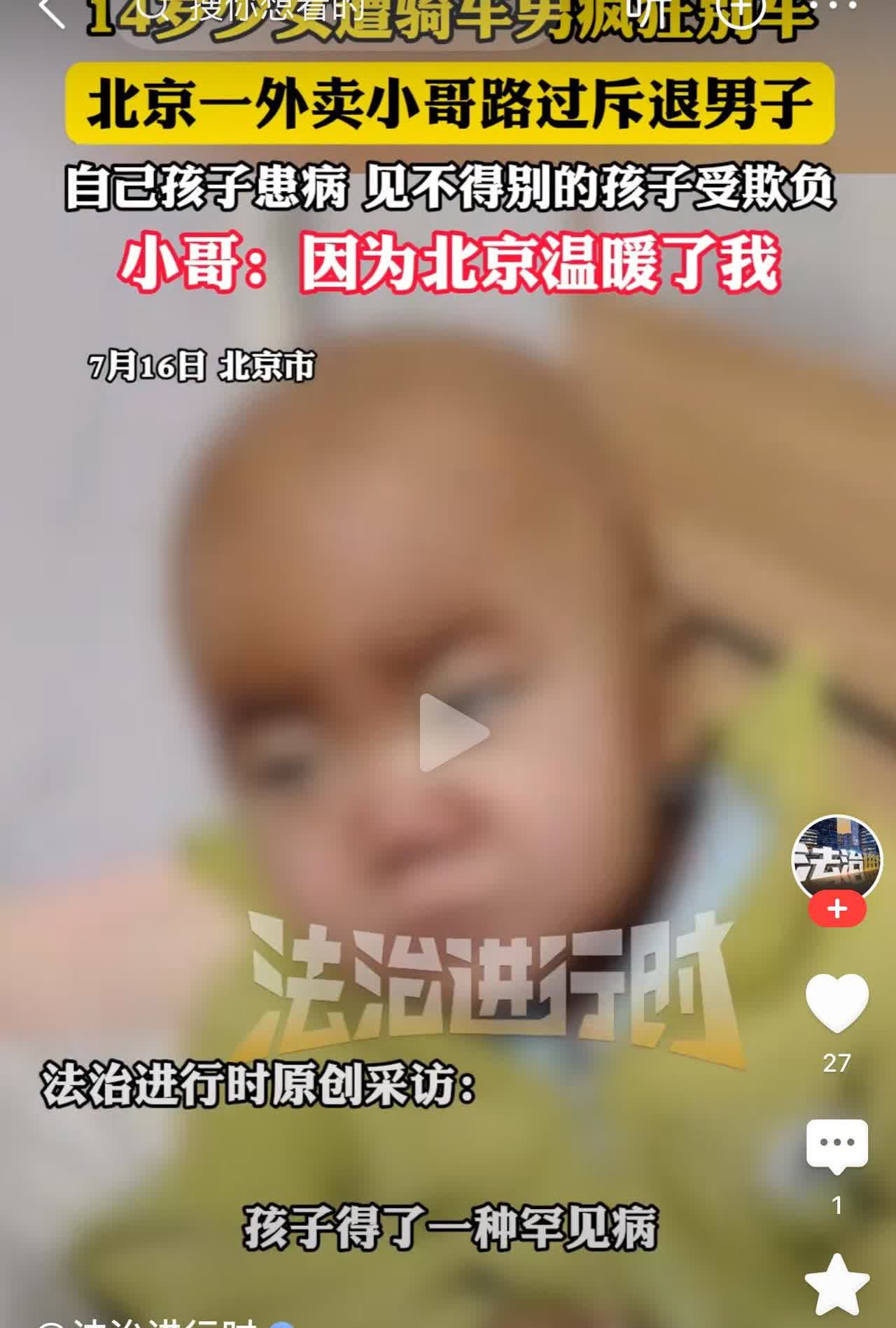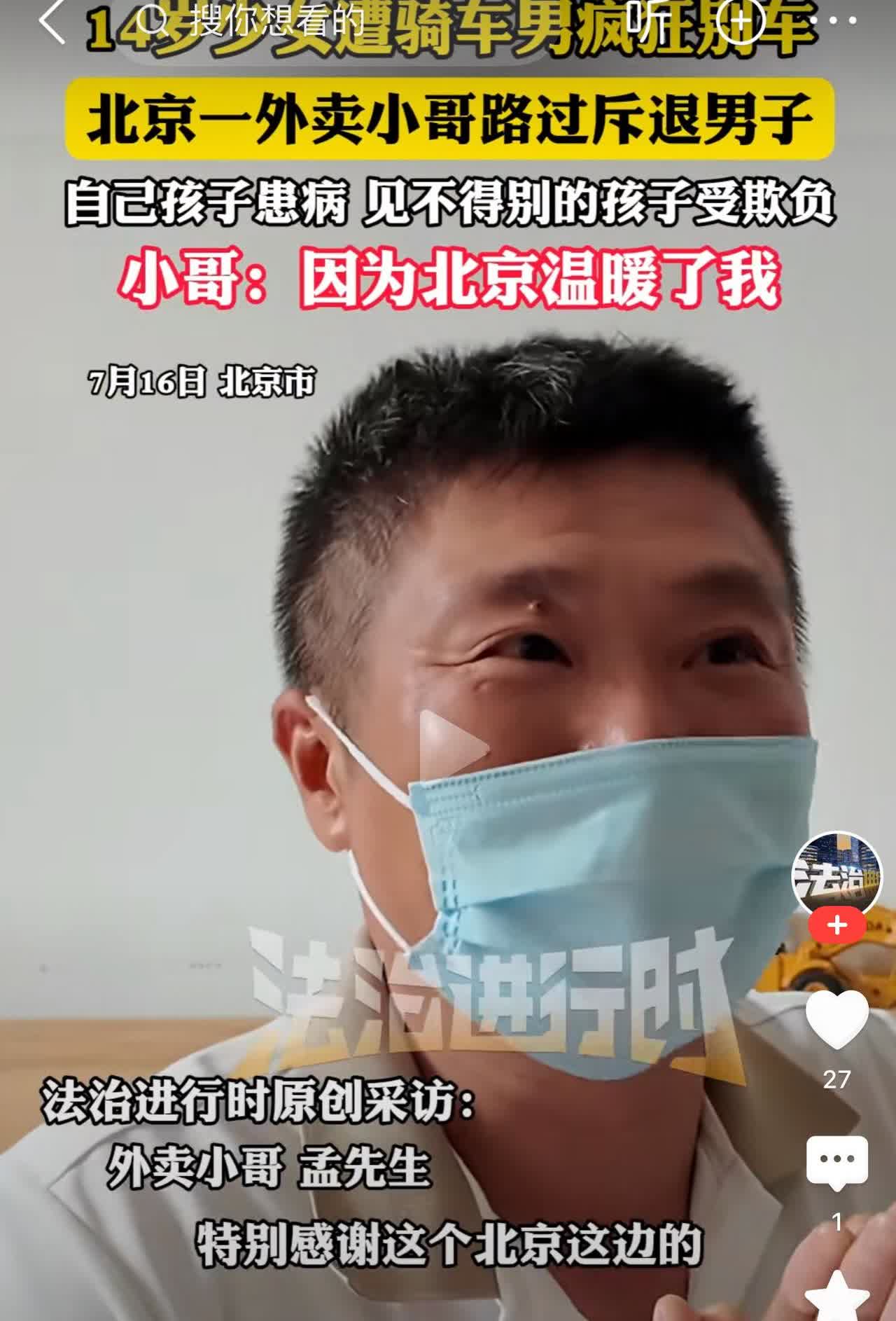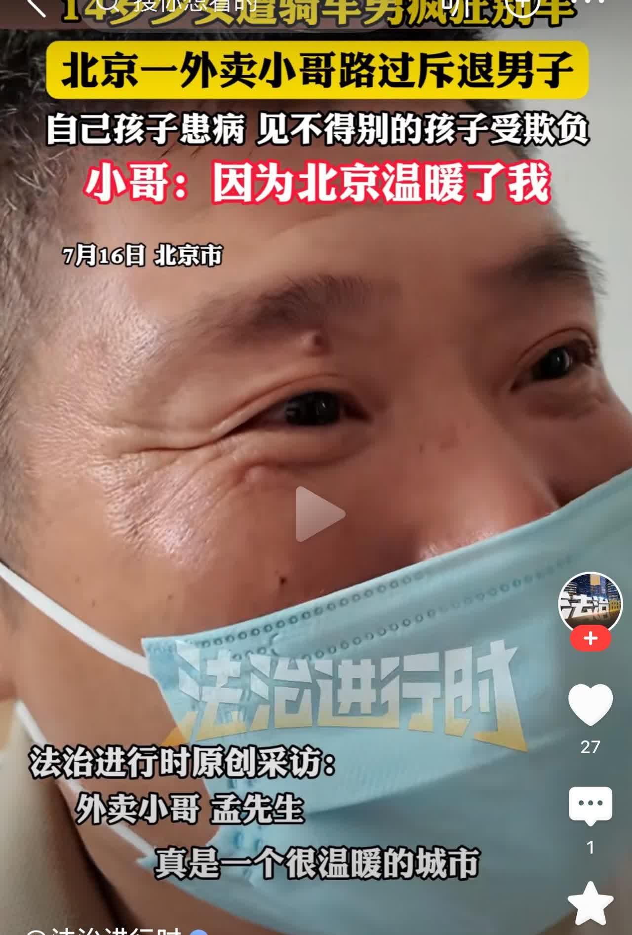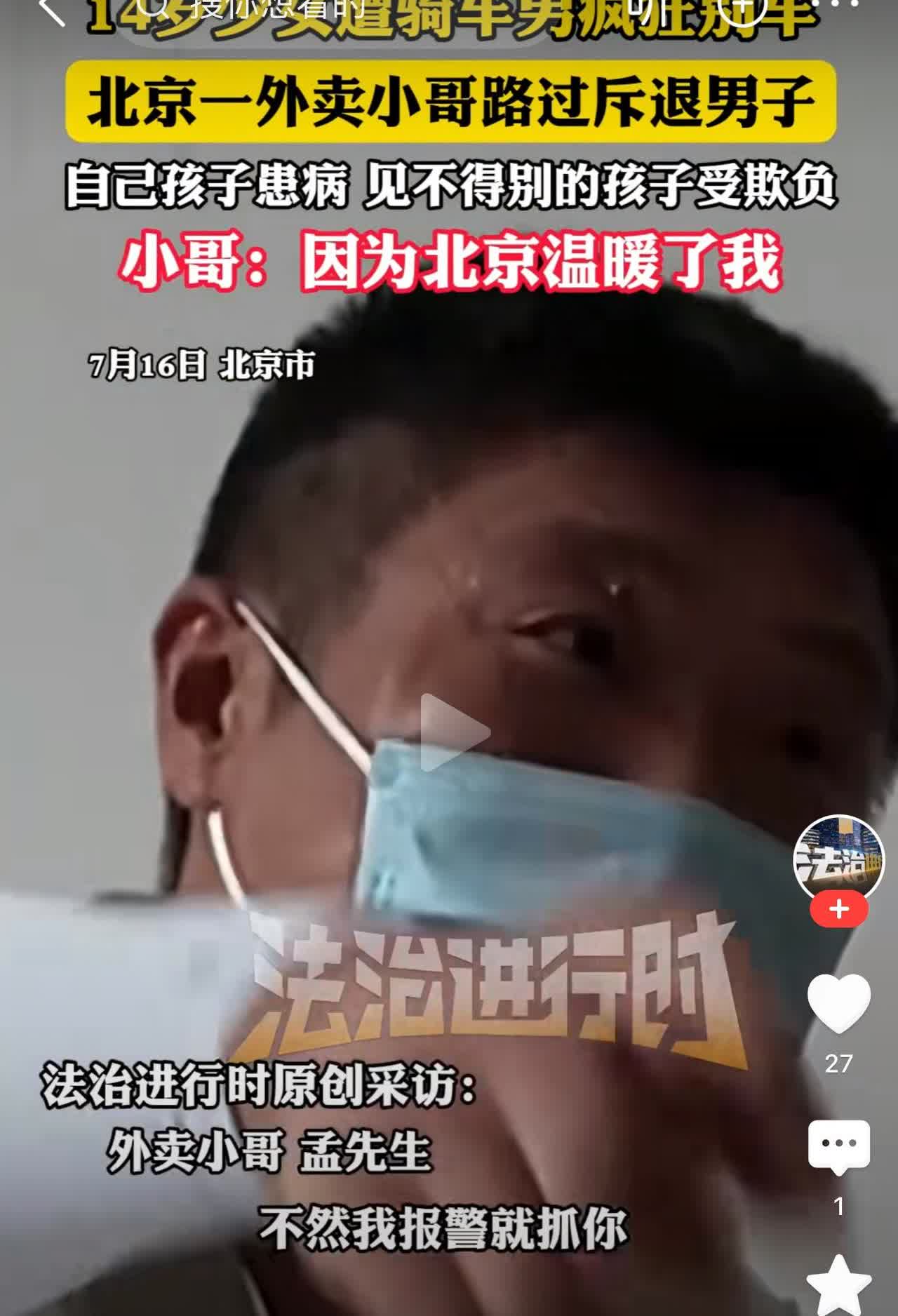这才是真正的“北京榜样”,北京感谢您 《法治进行时》报道,一名14岁女孩子骑行在自行车道,被一名男子多次故意别到机动车上,几乎发生生命危险。 一名路过的外卖员勇敢的救下女孩儿,斥责那名故意伤害女孩的男子。 记者询问这位来自河南的外卖兄弟,他说,因为北京人帮助过我,北京是一座温暖的城市。 原来,这位外卖员的孩子得了一种严重的疾病,变卖了老家所有的家产来北京治疗,在穷困潦倒之际,受到了北京人多方无私的帮助,怀着一颗感恩的心,回报北京人,回报这所温暖的城市。 相比那些挖空心思,毫无知恩图报之心,为博取流量而故意制造地域、阶层矛盾之流,这才是我们一直提倡的社会主义核心价值观,这才是一个城市应有的温度,更是在这座城市打拼的所有人应有的态度。 @北京西城 ,这才是我们需要的真正“助人为乐、见义勇为”的“北京榜样”!因为他暖了我们的心,我们不能寒了他们的心! 这不仅是我们北京需要的,我想,也应该是全天下所有百姓需要的! 您说,我说的对吗? ——————