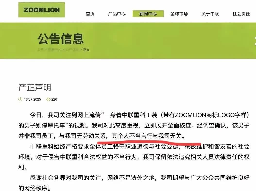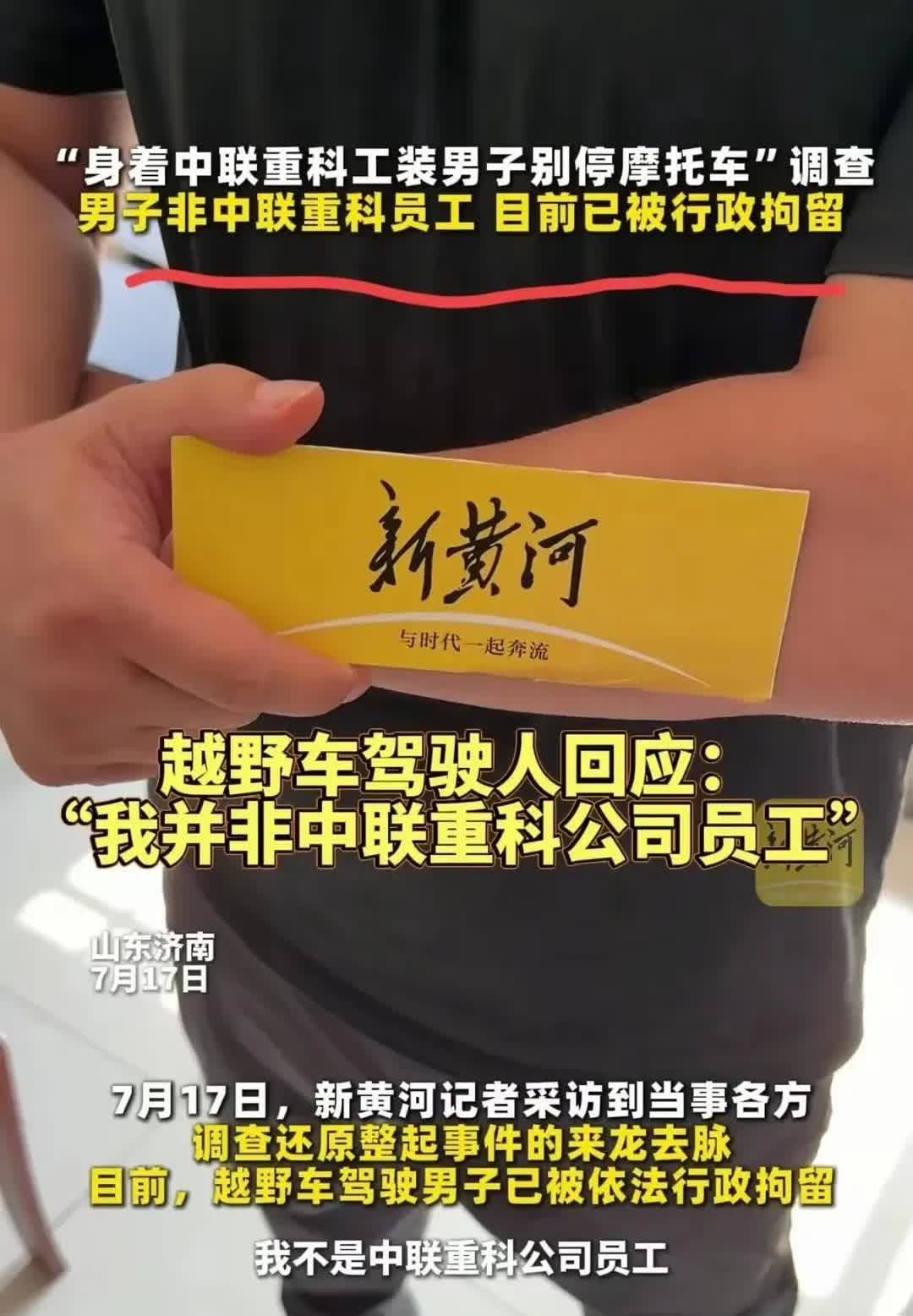 这下老实了 黑衣男子没料到这么快自己就受到了应有的惩罚 目前身穿中联重科衣服开黑色越野车的男子已经被行政拘留,黑衣男子也亲口承认自己不是中联重科的人,看来中联重科那边的发文是没有问题的,他们只是合作伙伴关系。 只是中联重科的公关团队太没有水平了,前两句话说得没毛病,但是第三句话“其个人不当言论与我司无关”。哪怕是合作关系,但是他穿了你们公司的衣服,那他的一言一行就与你们有撇不开的责任。 中联重科起码应该有个态度,比如取消和他的所有合约,或者和所有合作商都能谈谈话,告诉他们尽量不要损害公司的名声。 这么没有素质没有德行的人怎么配和大企业合作,作为销售经理就这个态度出去和客户谈生意吗?