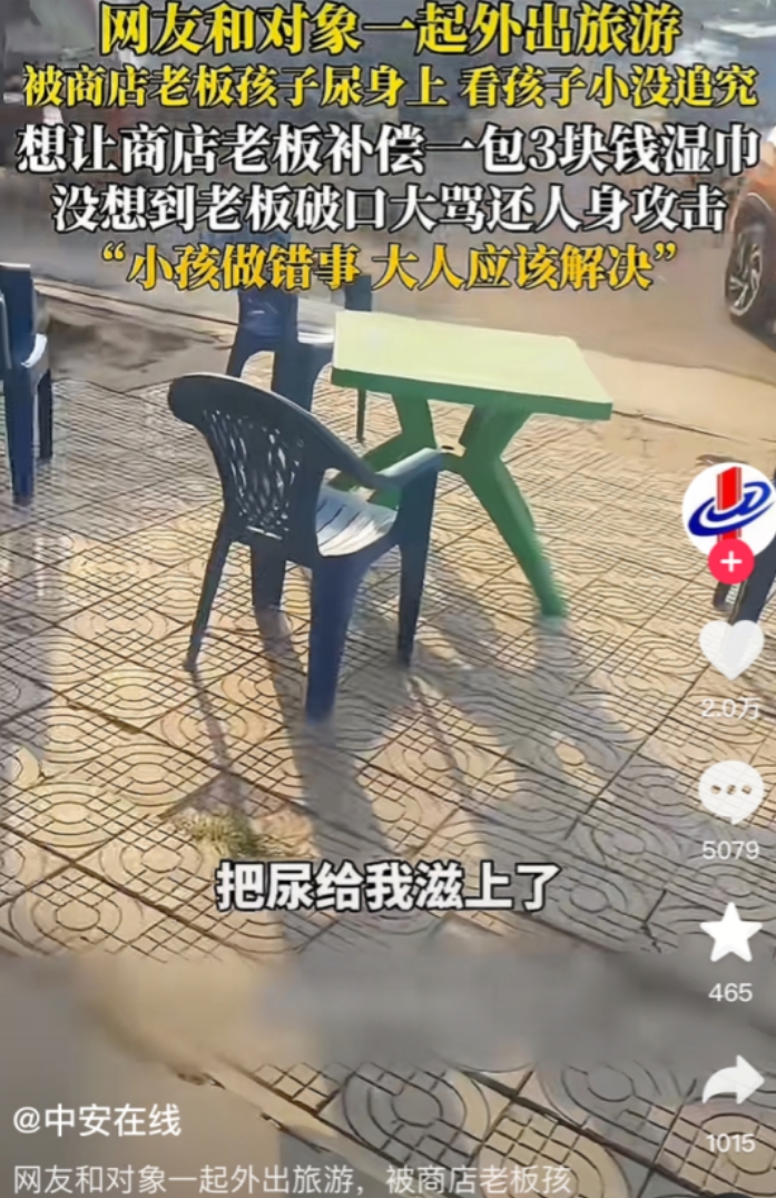 “惯子如杀子!”小情侣去甘肃游玩时,不慎被便利店老板的小孩尿了一身。情侣看孩子小没有过多计较,但希望老板免费给一包湿巾让他们清理一下。可不料,便利店老板听完立马翻脸,还怒骂:“咋没尿你嘴里!”甚至推搡男子,报警后依旧嚣张的不行。