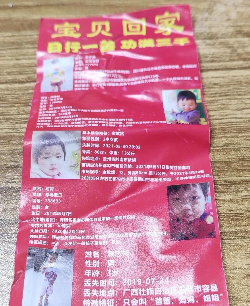 网购的包装里塞了一张红色纸片,拿出来我以为又是截图好评类的或扫码有奖什么的。 打开一看是找孩子的,不看不知道一看吓一跳,原来一直都有丢孩子的,而且都是南方。 最晚有2021年丢的,这说明什么?还是看管不到位呗,让孩子离开你的视线了。 为什么北方或者东北没有丢孩子的?因为一般也不多生,大多一个,顶多两个。 我就想起谢浩男妈妈丢失谢浩男的事来了,领着孩子在家门口玩,已经快天黑了,竟然留下孩子转身回屋给孩子取衣服去了,回来孩子就丢了,一丢就丢了24年。 老谢能和她又生了三个,说明老谢够仁义了。 换个人早打个半死了[捂脸][捂脸][捂脸]!