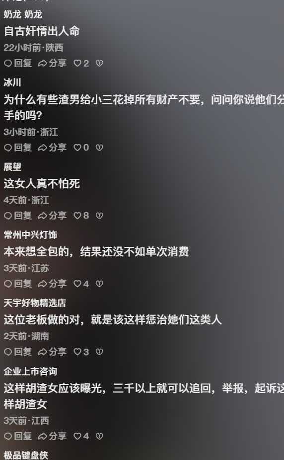 自古奸情出人命。 24 岁小仙女为了实现财务自由,便想到了与年龄相差 26 岁的老板交往,没想到小仙女用钱速度太猛,不到3年就将老板财产挥霍一空。 更离谱的是该女子在和老板交往的同时还同时和多名男性保持暧昧关系,曾和男闺蜜兜风致车报废让老板去善后,真的震惊三观。 当老板钱财没有之后,小仙女第一时间便打算和老板离婚。但是老板也不是傻子,于是强行住进女子家中,并且称房子及装修费用均由自己支付,并出示转账记录:为帮女子还信用卡,他半价卖新车、变卖价值 10 多万的金器得 8 万多,累计投入近 20 万。 老板控诉更离谱的是新房装修 3 天就带陌生男子回家,被监控拍下。女子称对方是男闺蜜,愿赔 4 万和解。但是老板拒绝了和解。 大家觉得这个女子离谱?