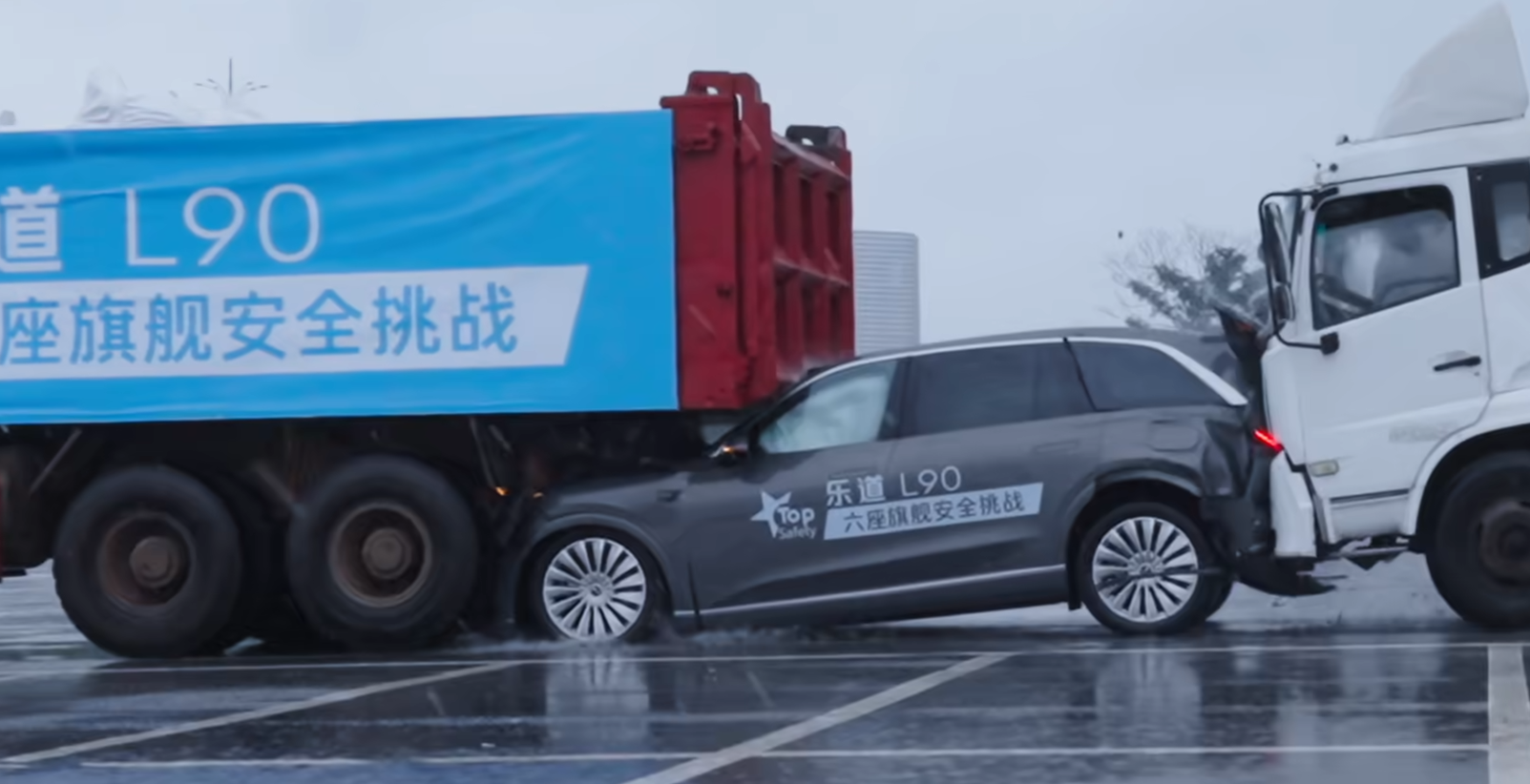 理想i8这种短车头有安全隐患 在国内开车,高速上大货车很多 一个非常典型的案例就是追尾大货车,这有很多例子了 而理想i8这种短车头前部预留的溃缩空间很短,同时又非常容易钻入货车尾下,对第一排乘客和司机的生命威胁巨大。 你想想这个车如果来个“38吨50公里雨夜前后夹击”,尖而短的前鼻钻入前车尾梁 下,那是真的所有冲击力都要由那一对A柱去承受了。 要是A柱输了一切都没有意义了 而乐道L90这种传统造型,首先是溃缩区更长,另外车头可以顶到货车的后轮,承担很大一部分冲击力 因此我强烈建议理想做一个和乐道L90一模一样的大货车前后夹击的安全测试