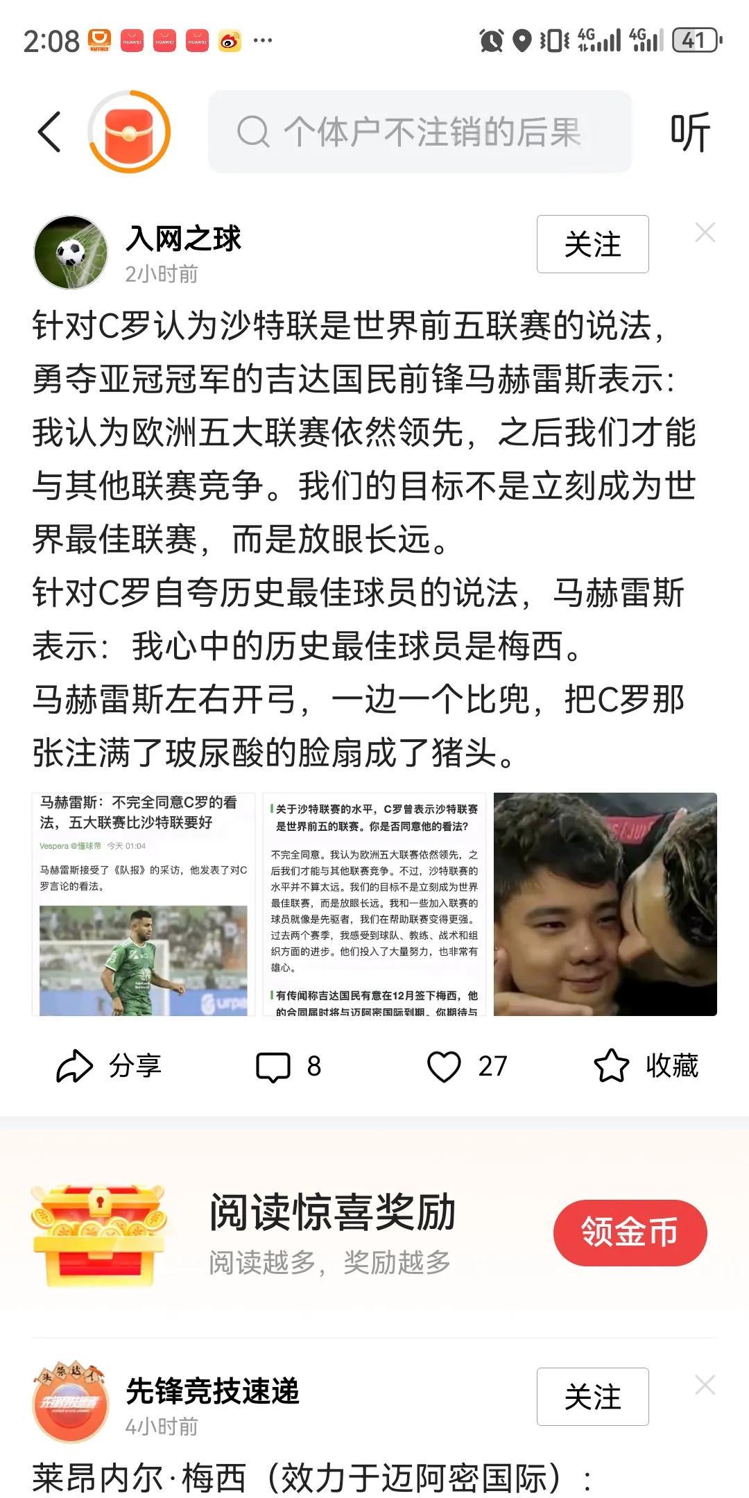 C罗在沙特发表过两大惊人言论,转身就被人或事实打脸!来看看C罗的两大言论: 1、我就是世界最佳…… 首先被大罗站出来驳斥,随后更被专业机构IFFHS把C罗硬生生排在了第四,如果真如C罗粉丝所言,国际足联排挤打压C罗,C罗能当老四? 2、沙特联赛比五大联赛某些强… 五大联赛C罗只有德甲与法甲未登陆,而法甲当时未曾拥有过欧冠,还是梅西曾效力过,言下之意十分明显… 哪些人站出来驳斥过就不列举了,当届亚冠冠军主力前锋应该是有发言权的。而法甲也终于欧冠夺冠了,这才是打脸C罗的最有力底气。 有趣的是亚冠冠军主力前锋认为最佳应该是梅西…… 这算不算打脸?