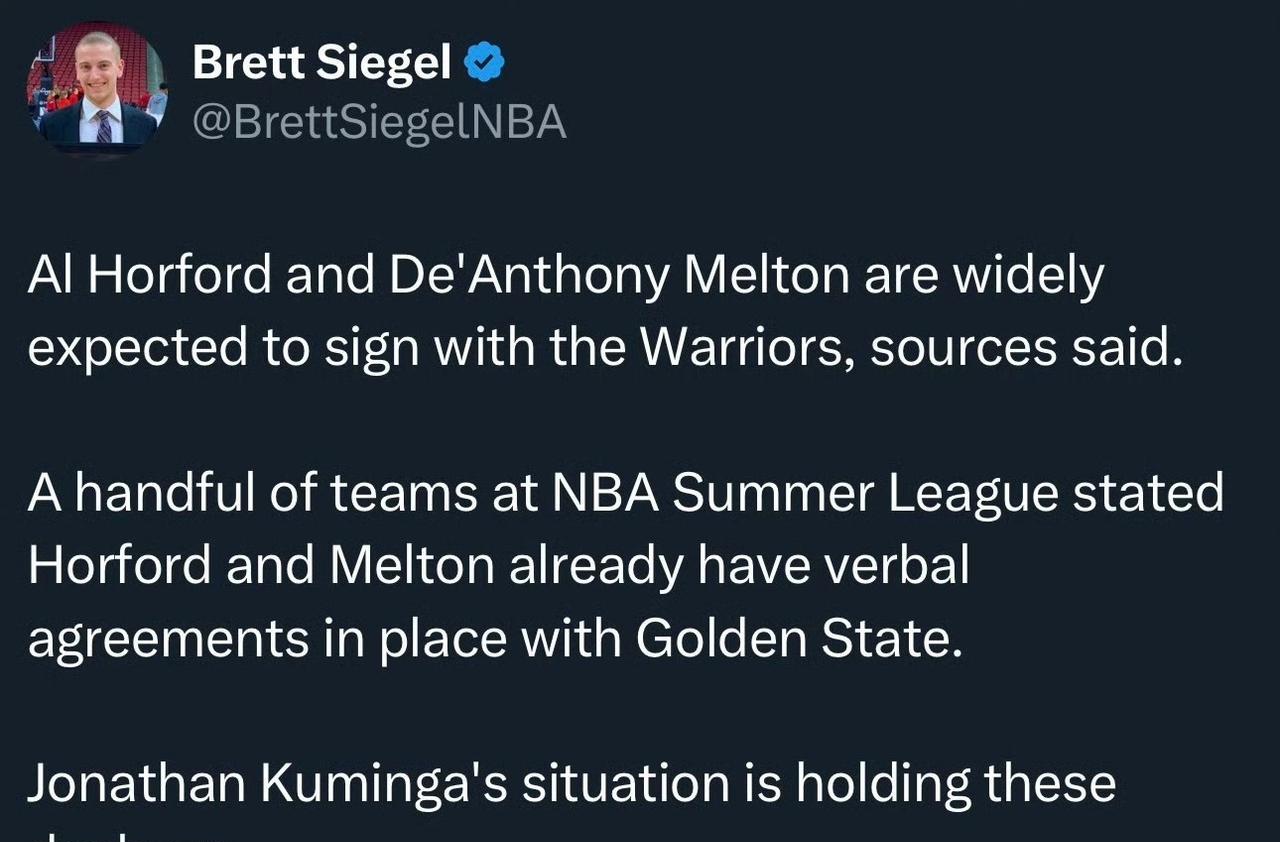 勇士休赛期补强来了!!!霍福德和梅尔顿口头承诺加盟勇士! 根据记者BrettS