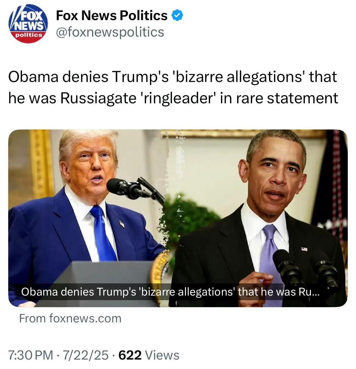 奥巴马罕见发表声明否认川普关于他是 "通俄门"头目的离奇指控。 川普最近被爱泼斯坦名单弄得狼狈不堪,为了转移视线,他的情报部长突然把老早之前的阴谋论抛出来,还说要对奥巴马进行刑事诉讼。不过估计司法部长邦迪不会踩这个坑,因为这就是个无厘头的指控,邦迪已经因为爱泼斯坦名单惹了一身骚,不会再抹自己一脸屎。