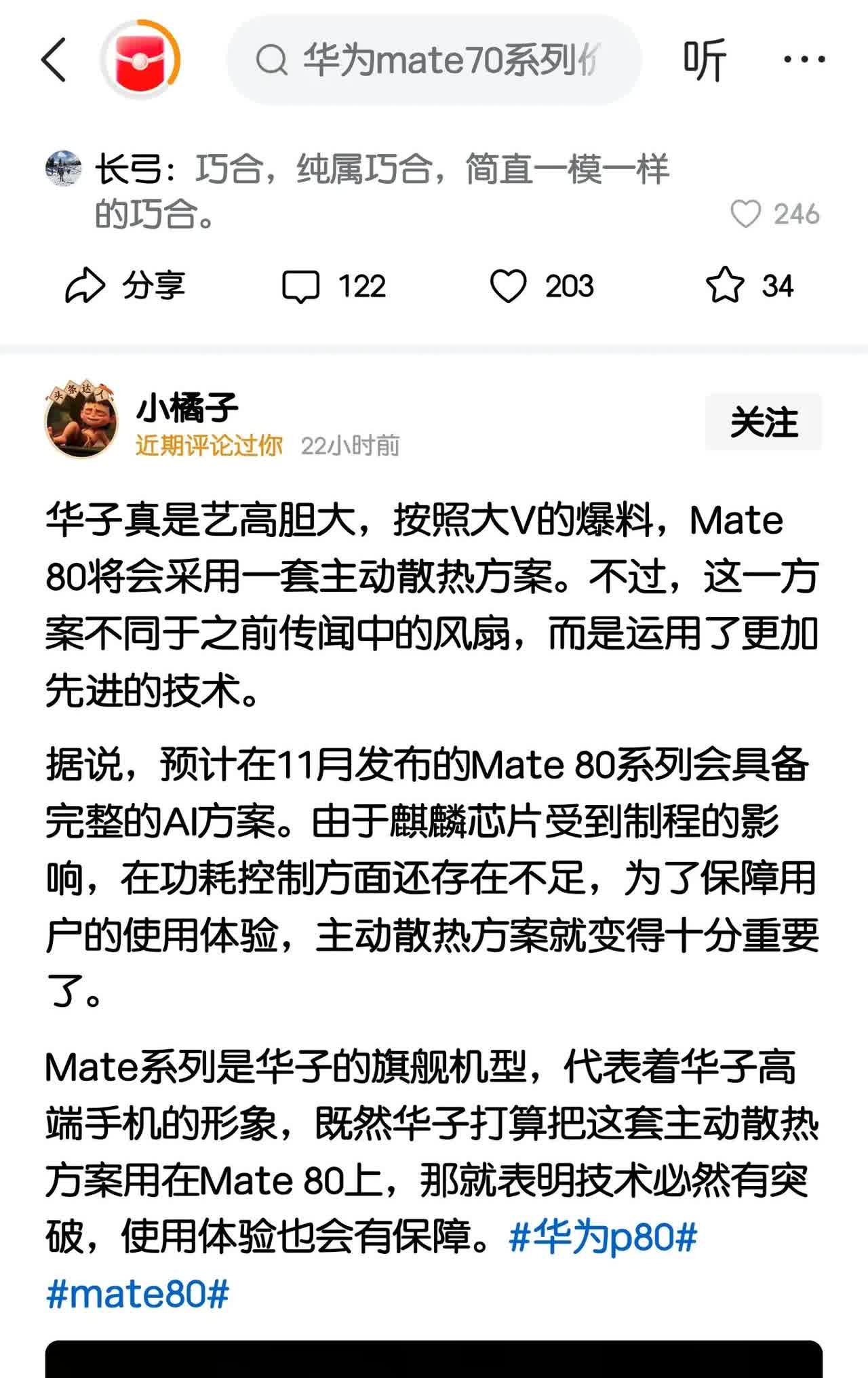 华为真的要给手机上主动散热了 据一大V透露,华为要手机上主动散热了,不过不是之前传说的主动风扇,是有新的散热技术。 综合这些信息来看,mate80系列搭载的9030芯片估计要大升级,芯片频率增加,热量也会相应增加,需要主动散热设备来辅助。 就看华为能整出什么样的主动散热技术出来了,期待mate80系列的表现。
