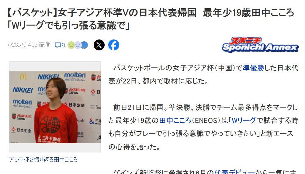 日本女篮19岁新星田中心渴望到海外打球。在女篮亚洲杯上,田中心领军的日本队淘汰张