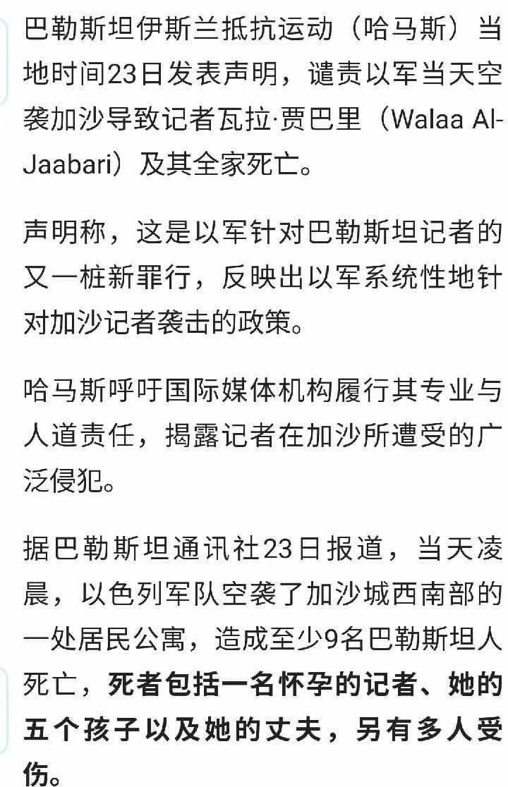 以军再杀记者!怀孕记者和她的五个孩子及丈夫等九人死亡!累计已有480名记者遇难! 据巴勒斯坦通讯社23日报道,当天凌晨,以色列军队空袭了加沙城西南部的一处居民公寓,造成至少9名巴勒斯坦人死亡,死者中包括怀孕的记者瓦拉·贾巴里(Walaa Al-Jaabari)、她的五个孩子以及丈夫,另有多人受伤。 这已经不是以军第一次袭击记者了,自2023年10月7日冲突爆发以来,已经有至少480名记者在以军袭击中死亡。 其中2023年10月到12月底至,加沙地带至少48名记者死亡,日均1.6人。 2024年死亡人数突破201人,其中12月单日即有5名记者在努赛赖特难民营空袭中丧生。 2025年截至7月23日,半年多累计死亡人数已达231人。 以色列这么有系统性的袭击记者到底在掩盖什么真相?有什么不可告人的秘密,还是他们明知自己的种族灭绝罪行害怕被公之于众? 面对这起造成记者全家遇难的空袭,哈马斯呼吁国际媒体机构履行专业与人道责任,将加沙记者所遭受的广泛侵犯公之于众。 这是以军针对巴勒斯坦记者的又一桩新罪行。此次袭击并非孤立事件,而是以军系统性针对加沙记者实施袭击政策的又一印证。 #以军加沙行动# #以军封锁加沙#