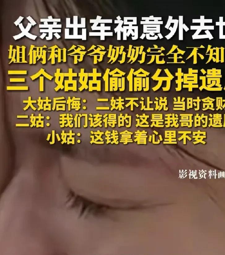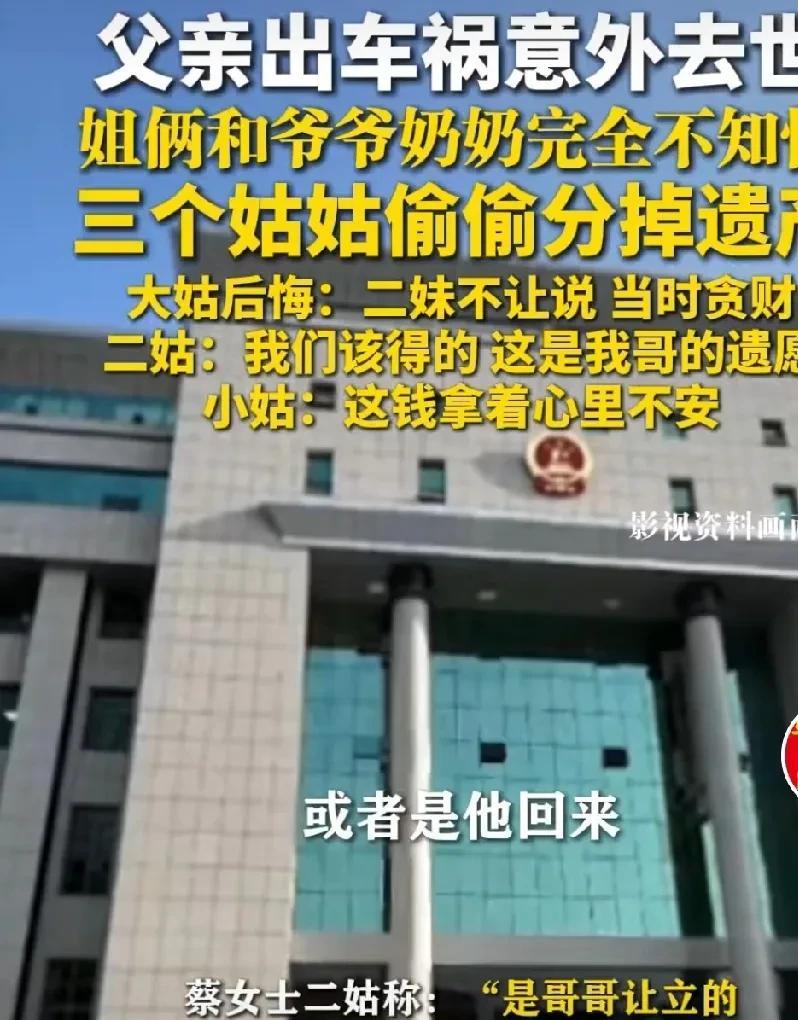 “这是拿命换来的钱也敢分。”三个姑姑的素质令人堪忧呀,真是大千世界,无奇不有,这是电视剧才出现的一幕,在现实生活中竟然发生了。 据法治视讯报道,近日,河南商丘的一位蔡女士反映,今年1月份他们的父亲就因为车祸去世了,三个姑姑偷偷的把他们父亲去世得的赔偿金分掉了,而他们姐妹俩却毫不知情。 蔡女士说,他们姐妹在很小的时候,父亲和母亲就离异了,他们跟着爷爷奶奶一起生活。她有三个姑姑,姑姑们和他们平时也经常走动,但算不上亲密无间。 现在让他们心寒的是,他们姐妹俩已经失去了父亲,三个姑姑竟然没有通知他们姐妹俩和他们的爷爷奶奶,而是偷偷的把那笔应该属于他们的赔偿款分了。 对于三个姑姑的贪婪嘴脸,蔡女士决定用法律的武器维护自己的合法权益。 她的三个姑姑中,有两个姑姑现在悔悟了,她的大姑表示,现在很后悔,当时是二妹出的主意,她不让说,自己当时鬼迷心窍,贪财就不说了。二妹是得利益最多的那个人。 小姑也表示,现在拿着这些不属于自己的东西,内心也不安。 只有她的二姑到现在还没有醒悟,还嘴硬,说这是我们该得的,这是我哥的遗愿,我没通知老人,我很抱歉。她二姑贪得无厌的嘴脸,让网友都看不过去了。 根据继承法规定,父母和子女是第一顺位继承人,赔偿款只有爷爷奶奶和蔡女士姐妹俩可以继承遗产,三个姑姑是第二顺位继承人,在有第一顺位继承人的前提下,第二顺位继承人不能继承遗产,三个姑姑必须把侵占的遗产退出来。 视频一经发到了网上,引起了网友们的热议,有网友表示, 支持蔡女士,把属于他们的钱要回来。 还有网友说,看看湖北的那个大伯伯母,人家连侄女在哪都不知道,还要花很多时间去找到,让侄女去继承其父留下的房子和存款,两者相比较,真是感慨万千啊。 真是,一粒米养出千种人,对于不属于自己的钱财,有良心的人,拿着都会不安啊。