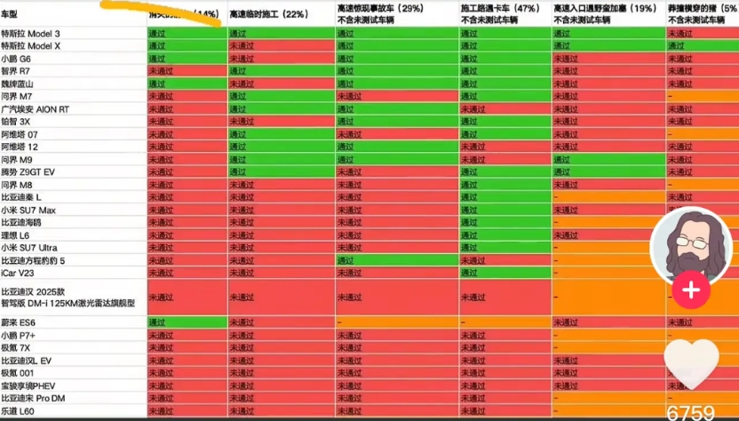 4,特斯拉 Model 3 / Model X,基本断崖式名列“第一梯队”:高速场景中 5/6 个项目通过,城市事故中 Model X 为 8/9,表现最优 。 华为系(问界 M7/M9)、小米 SU7、理想 L6、极氪 007 等表现不佳:如问界系频繁纠结刹车或违规变道,高速追尾发生率高