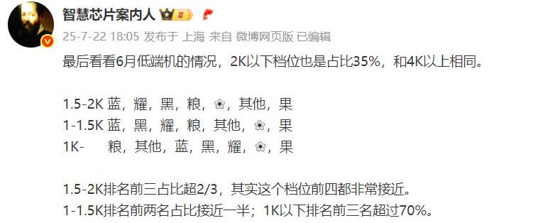 这是6月份国内低端(0-2000)元市场排名 1、1500-2000元:vivo、荣耀、OPPO、小米、华为、其它、苹果。前三之和占比超过三分之二,前四之间基本上都差不多; 2、1000-1500元:vivo、OPPO、荣耀、小米、其它、华为、苹果。前二之和占比接近一半; 3、1000元以下:小米、其它、vivo、OPPO、荣耀、华为、苹果。前三之和占比超70%。 PS:意外吗?vivo在低端市场表现也这么牛,1-2K它是整体冠军。千元以下市场肯定是属于小米的。