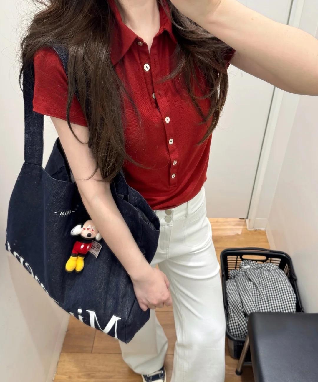 今年夏天超爱复古红,颜色不会很艳丽,但是又能够让人眼前一亮! 比如这里的红色polo领上衣,短款的合身设计可以很好的修饰身材,搭配一条白色的高腰直筒裤,增加清爽的感觉,夏日里复古又时髦。日常出街,可以加入棒球帽、帆布鞋和帆布包,很有韩系ins风的感觉,超好看。