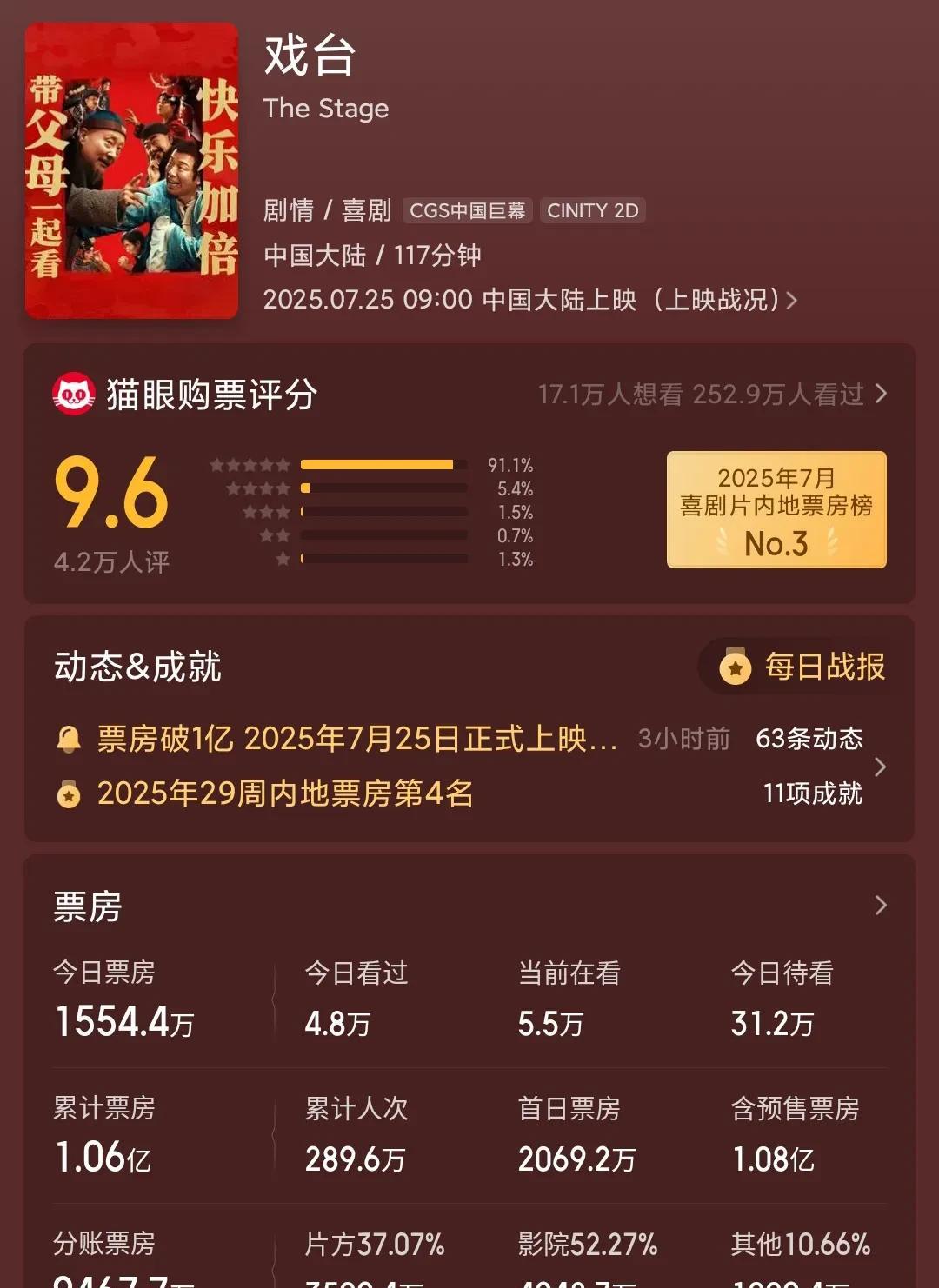 《南京照相馆》上映后带动暑期档大盘上涨,今天单日票房超过昨日,预计在2亿左右。上映前不被看好的《戏台》票房表现抢眼,预计总票房能达到3.59亿元,让陈佩斯小赚,把借的钱都还掉。 7月31日,《731》上映,今年暑期档能不能火一次,就看这部电影。