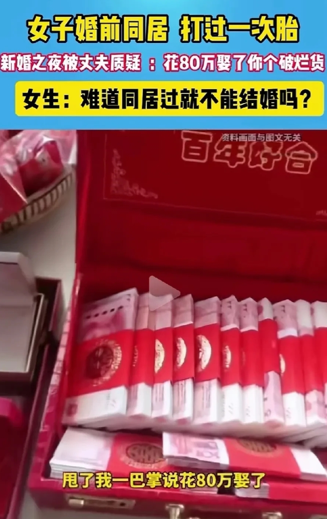 河南,女子新婚之夜被丈夫质疑生过孩子,本想着坦诚相待,把她婚前同居过,还不小心打胎的事实一五一十的告诉丈夫。结果不仅没有换来丈夫的同情和理解,反而被打了一巴掌,丈夫:我花80万就娶了你这么个人?女子非常委屈:难道同居过就不能结婚吗?