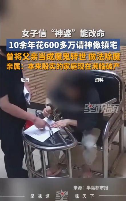 “离了个大谱!”山东青岛,女子机缘巧合下认识了一名“神婆”,此后十多年,她为了“消灾解难”,花费600多万元请数尊“神像”回家供奉!父亲实在看不下去,就将“神像”砸毁,不料,“神婆”却告知女子她父亲是魔鬼转世,必须做法除魔。网友:什么样的智商才会上这种当? 在以前科技不发达的时候,经常有骗子打着“神仙”的旗号,出来招摇撞骗,他们大多游走在农村或者山区,用一些简单的障眼法来蛊惑村民,以达到敛财的目的。没想到在21世纪的几天,还有人听信这种谎话! 据媒体7月25日的报道,2010年时,刘女士和母亲为了“祈福消灾”,四处寻找精通巫术的“神婆”,结果还真的被她们找到了一位! 这位“神婆”告诉她们,可以在家中供奉“神像”,这样“神像”就会保佑她们免受灾难的侵扰,二人信以为真,就花大价钱请了一尊回去。 此后十余年间,母女俩每当遇到事,就会去找“神婆”帮忙,而“神婆”则会为她们“做法事”,然后趁机推销自己的“神像”。 有一回,刘女士的父亲受不了了,就生气的砸毁了“神像”!结果却被“神婆”污蔑成“魔鬼转世”,让刘女士请人做法事,以此来避免不好的事情。 但谎言终有被拆穿的那一天,最终家刘女士母女察觉到了不对劲,便去派出所报了警,警方很快就将“神婆”逮捕归案! 网友看后表示,花600万买教训,这代价未免太大了!但好在迷途知返,不然整个家庭就毁了! 大家对于这件事是怎么看? 信息来源:《信“神婆”改命,女子10余年花600多万请神像镇宅,家庭濒临破产》半岛都市报