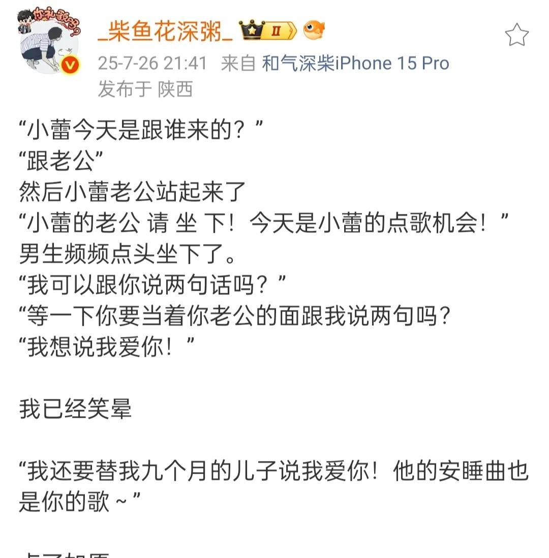 周深西安演唱会第一场点歌环节! 第一位西安的小雷! 周深:怎么称呼您? 小雷:叫我宝贝! 周深:这两个字从我的字典中从来没有出现过!换一个! 第一次听周深的歌是上大学的时候《化身孤岛的鲸》,是跟她老公(小张)一起来的! 还跟周深说了“我爱你”[笑哭] 点的是《如愿》 第二位还是西安的朋友佳佳,一位男歌迷! 一上来就“深深,爱你”[笑哭] 好热情的西安朋友! 是跟他女儿一起来的! 佳佳:我非常支持她,因为深深是非常优质的偶像! 点的是《漂流过海来看你》 #周深# #周深演唱会#