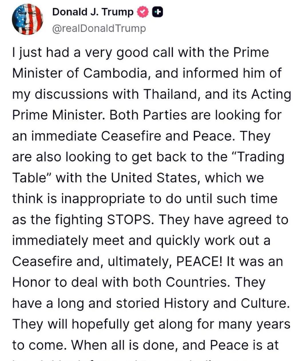 最新:特朗普宣布他促成了柬泰停火! “我刚刚与柬埔寨总理进行了一次非常愉快的通话,并向他告知了我与泰国及其代理总理的讨论。双方都希望立即实现停火和和平。他们还希望恢复与美国的“贸易谈判桌”,但我们认为在战斗停止之前这样做是不合适的。他们已同意立即会面并迅速商定停火,最终实现和平!很荣幸与这两个国家打交道。它们拥有悠久而丰富的历史和文化。希望它们未来能和平共处多年。一切完成后,和平实现时,我期待与两国签署我们的贸易协议!” 看来这位强力总统可以得好几个诺贝尔和平奖了。