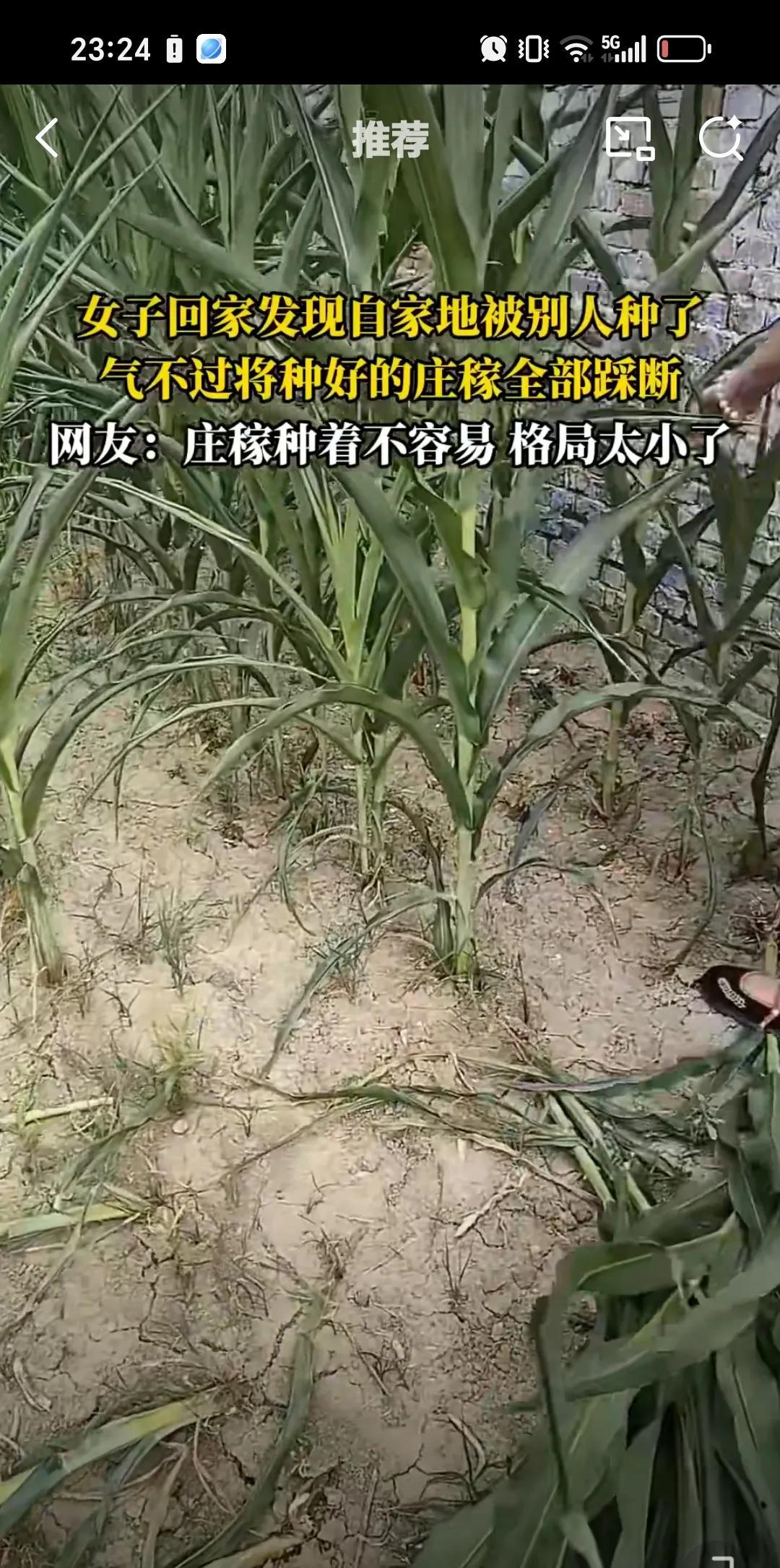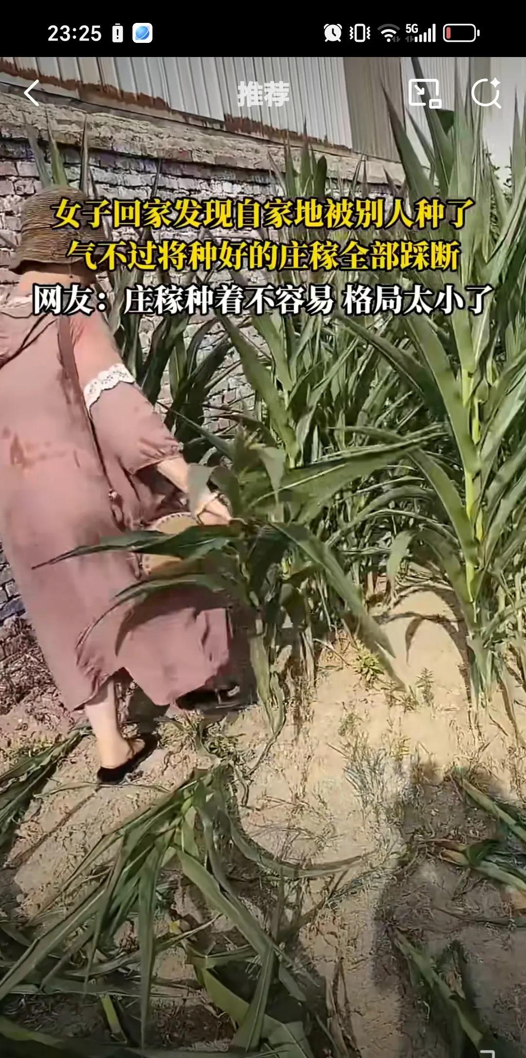 7月25日女子回家看到地被别人种了,气不过把玉米全给踩了。有网友说,种庄稼不容易