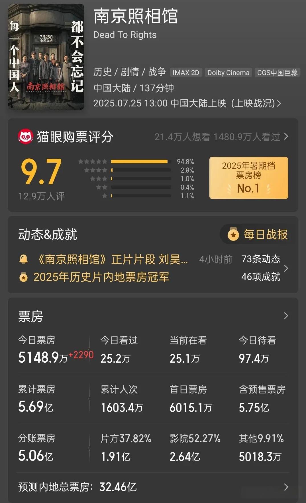 太炸裂了,几天没看,《南京照相馆》票房竟然涨了20亿。 记得前几天看《南京照相馆》的预测票房,显示还是12亿。 刚刚再一看,发现预测票房已经高达32亿。 短短一个周末,到底发生了什么? 那一定是上座率够高,票房增长够快,才让排片率更高,从而让未来走势如此被看好。 上映第一天票房1.3亿,上映2天票房2.2亿,今天是上映第五天,票房达到了5.7 说实话,这个假期《南京照相馆》是最合适家长带孩子一起看的电影。 之前《战狼2》《哪吒之魔童降世》等大爆的电影都是这种积极向上的主旋律题材。 期待《南京照相馆》一飞冲天。