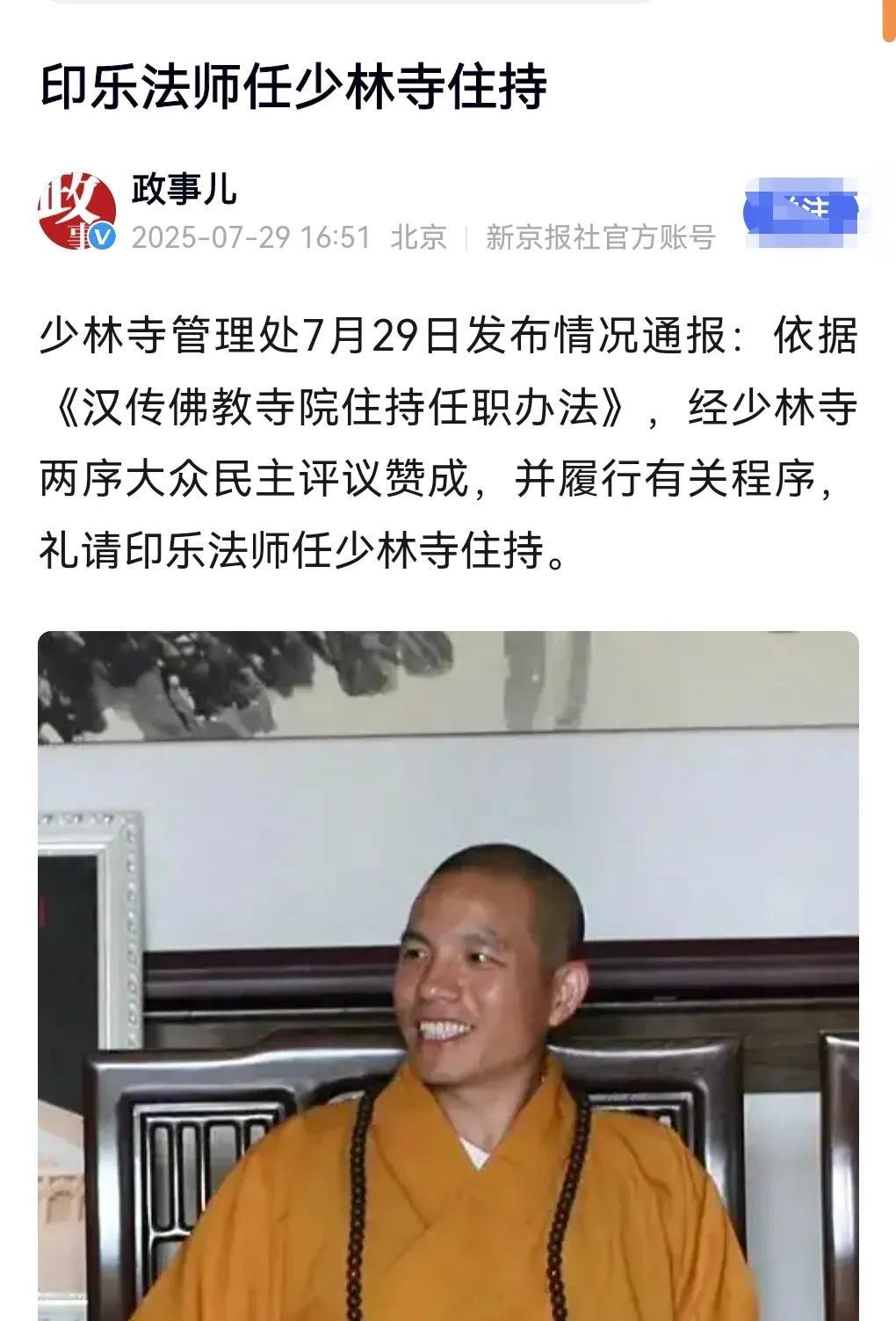 换人了换人了。 由于释永信自毁前程。 7月29日消息,印乐法师任少林寺住持,他此前是白马寺的方丈。 看来此人非常受到大家的认可,很有人气。 一定要稳住。