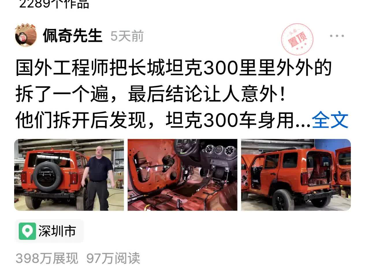 400万展现近100万人阅读,长城汽车坦克300已经努力的用品质可靠和销量数据的实力说话,奈何还是达不到许多国人的内心的要求…… 而在日本他们的人挺本田、丰田车, 而在德国他们的人挺宝马、大众车, 而在韩国他们的人力挺起亚和现代, 但在我们自己家里有人却说我们现在做大V8发动机是落后的、外观是模仿的、电车不是新能源、国产车不如合资车的…… 国产车真的就太难了!