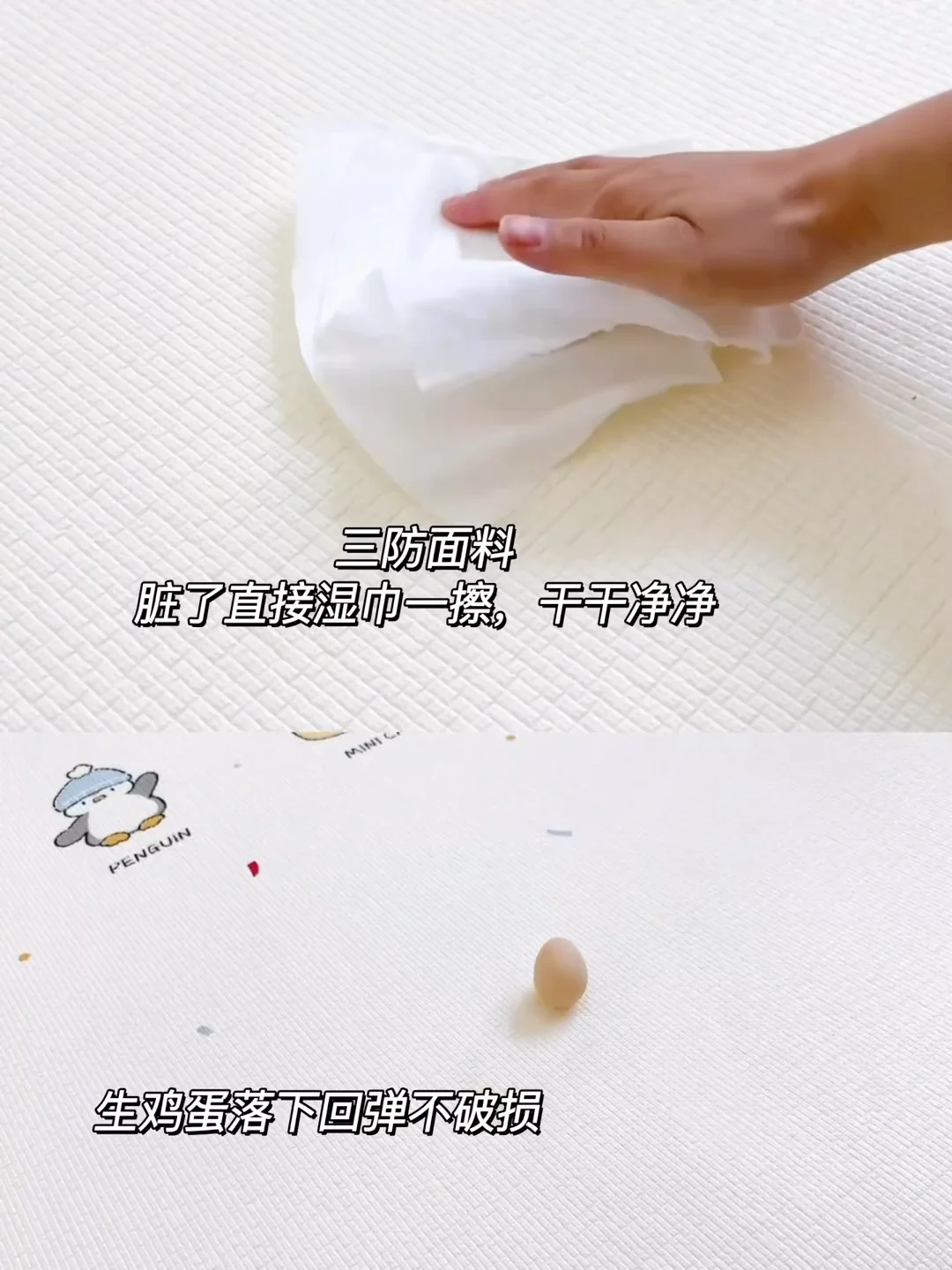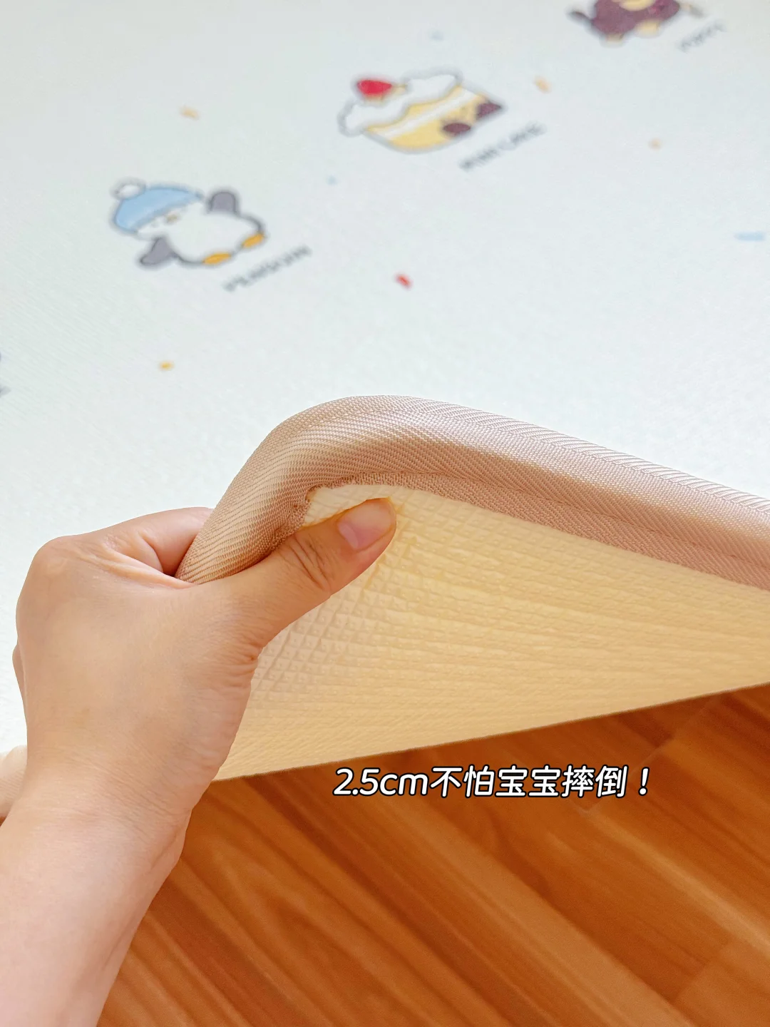 最让我满意的是它特别好打理!宝宝吃东西洒了、玩脏了,拿湿巾擦一擦,或者直接用水冲一冲就干净了,再也不用像以前那样担心缝隙里藏脏东西。而且它有2.5厘米厚,是XPE材质的,软软乎乎又有弹性,宝宝学抬头、翻身、爬、学走路都特别合适,摔了也不疼。