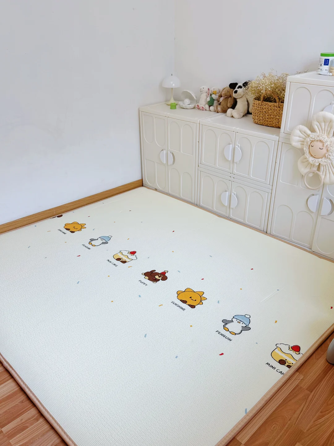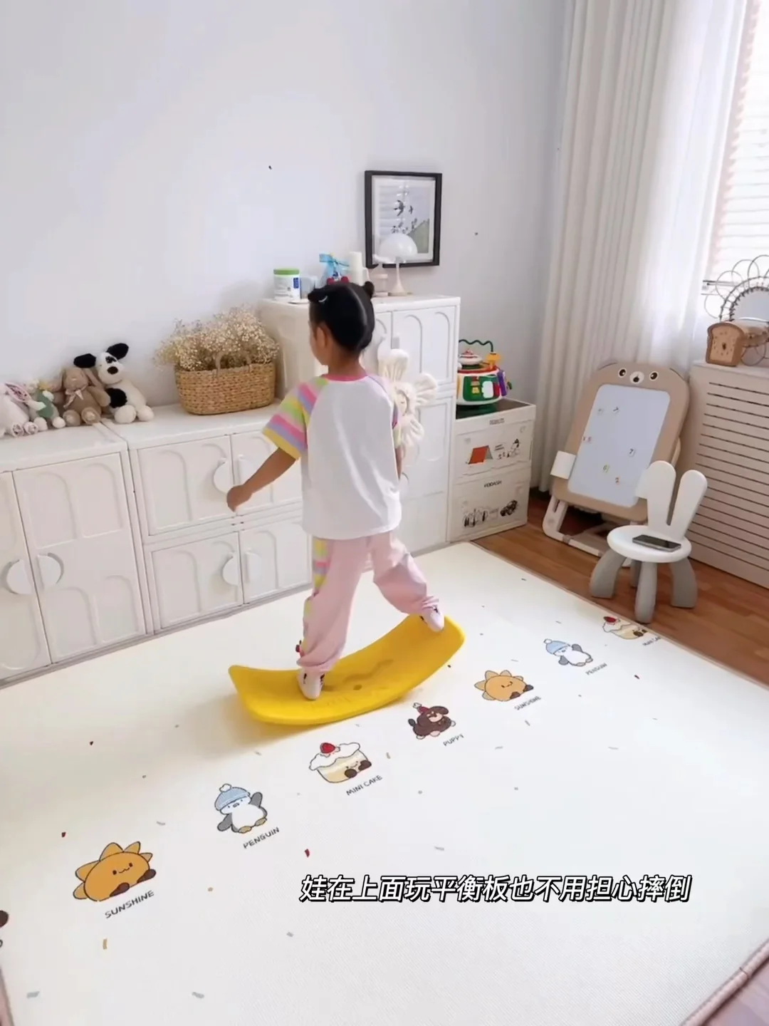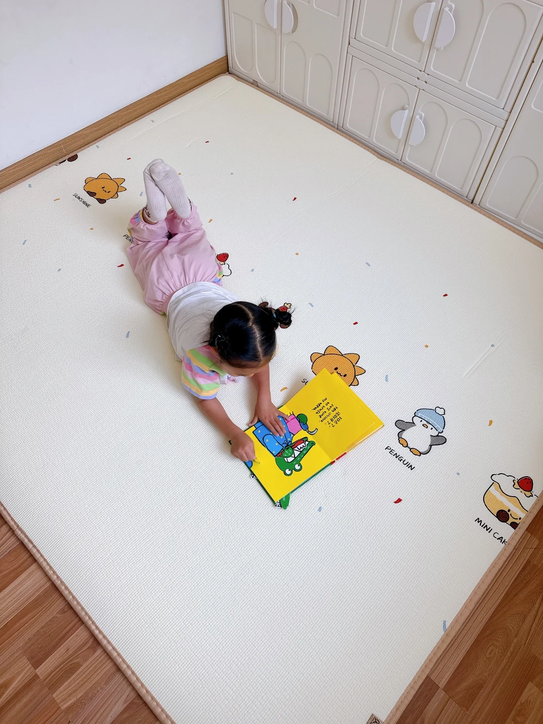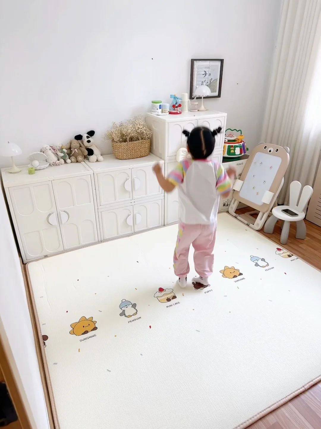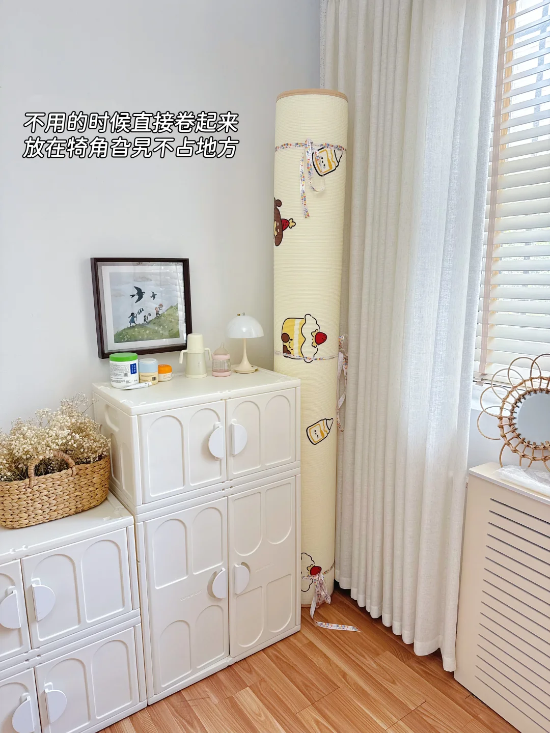 我家闺女现在天天抱着绘本、玩具在上面玩,自己能玩一整天,我终于能喘口气歇会儿了!不用的时候卷起来往墙角一放,一点都不占地方,小户型家庭真的太需要了!