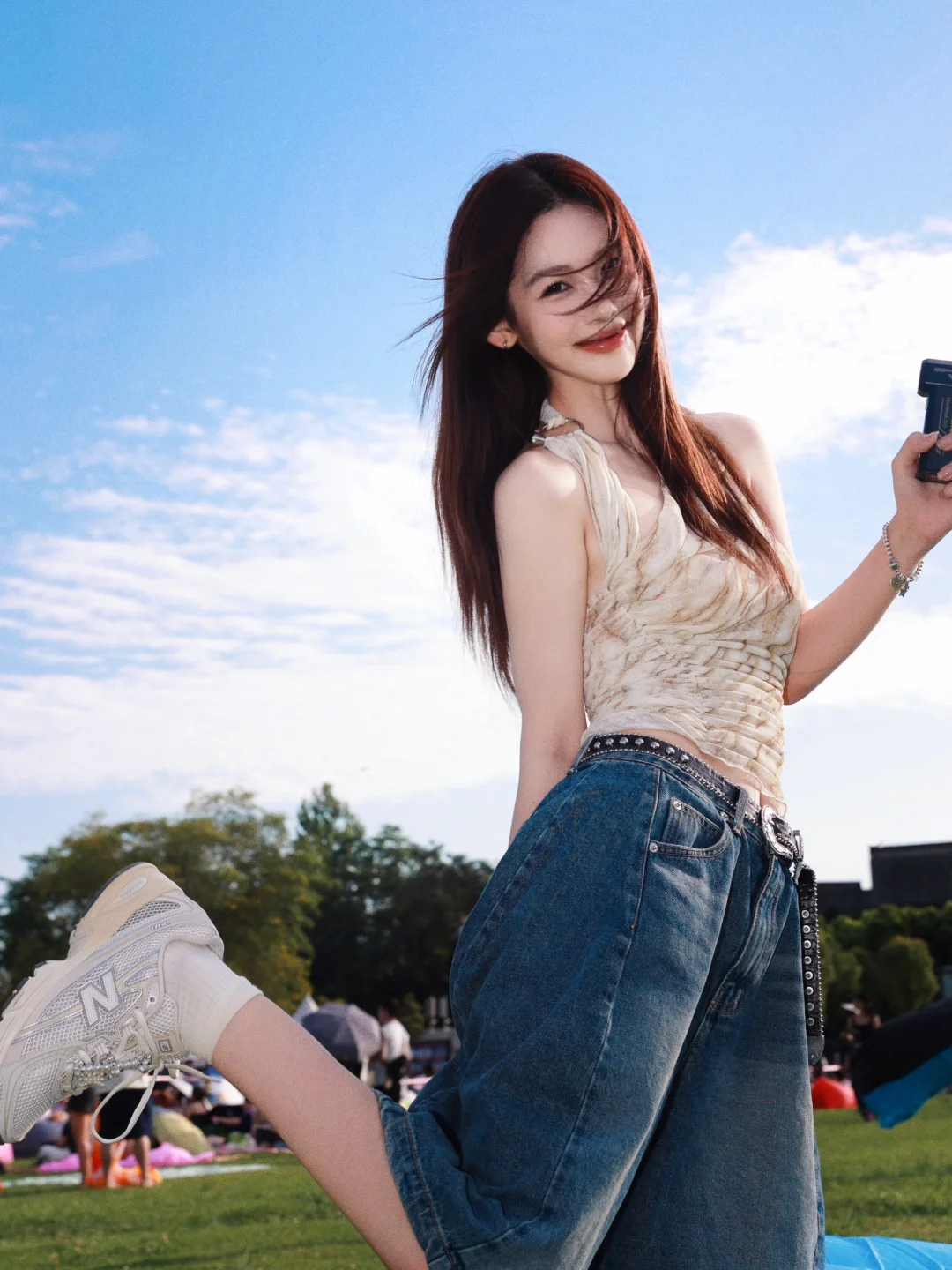 陈瑶秋日穿搭,咖啡色背心牛仔,轻曼时尚