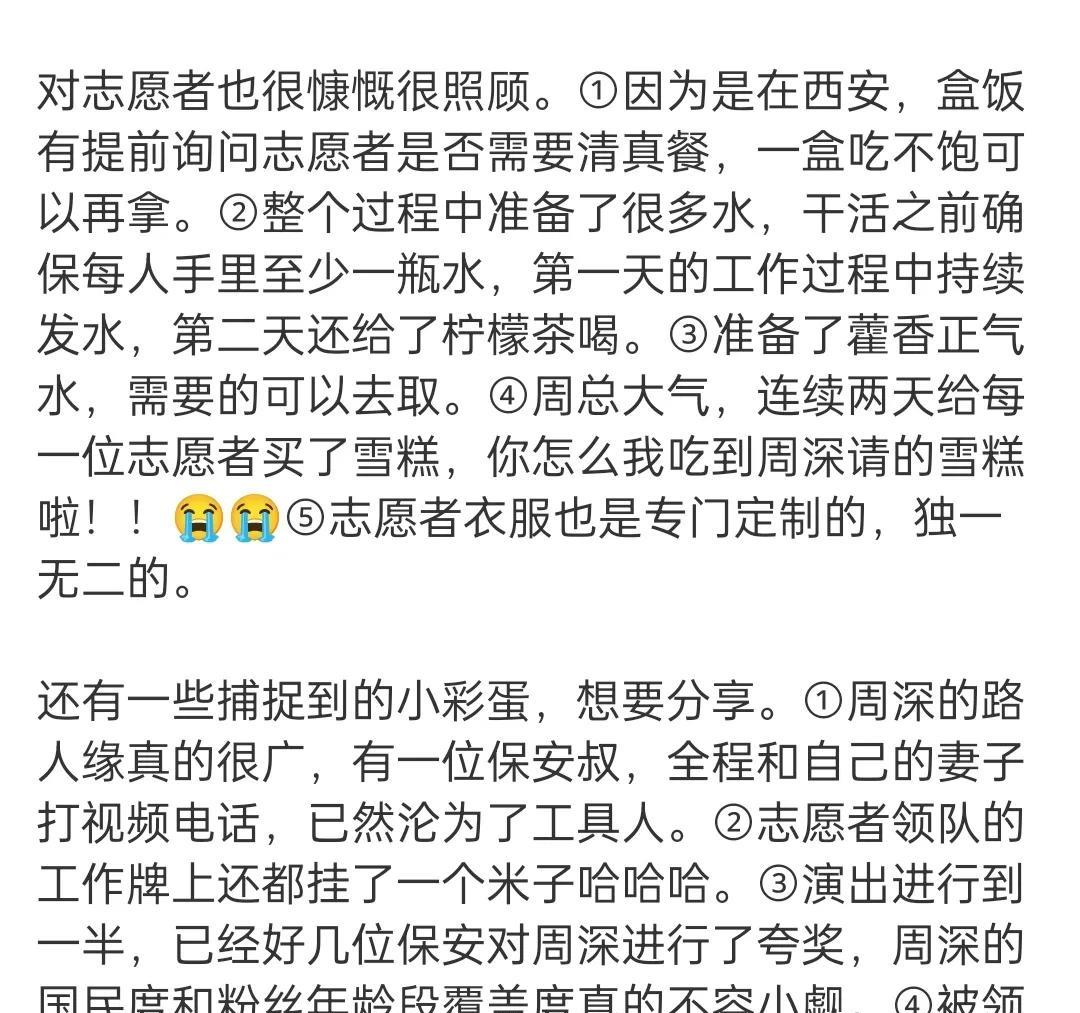 周深的周是周到的周! 还有水炮,水炮里面的水用的纯净水,还加了食品级水溶性香薰 ,难怪大家都觉得香香的! 志愿者也有非常好的待遇,有雪糕,有藿香正气水,有足够的饭和水!因为有少数民族,还特意准备了清真餐,真的是太用心了!太细节了! #周深# #头号创作者激励计划#
