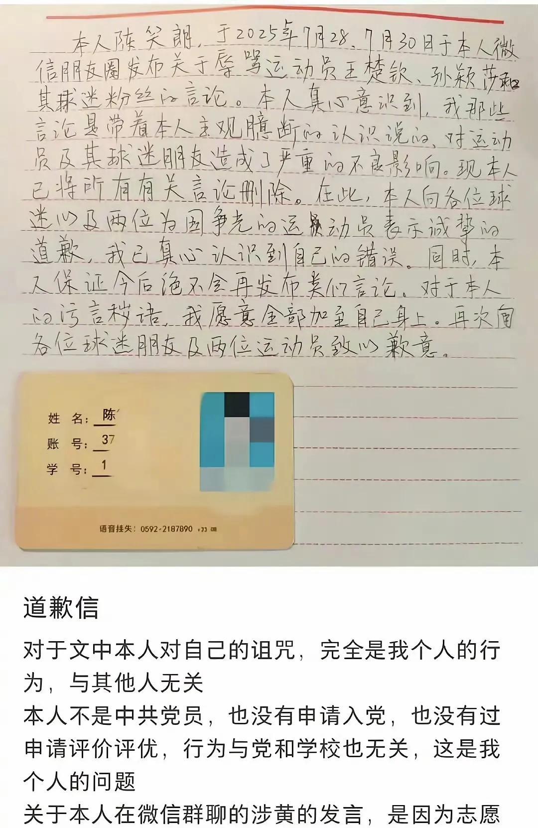 辱骂运动员的厦门大学学生陈某某是竟然是学生干部,不但曾作为学生代表发言,还担任“乒乓球协会宣传部部长”,还是乒超联赛厦门站志愿者。 厦门刚刚成功举办了乒乓球赛事,就有志愿者陈某某--厦门大学外文学院2023级日语专业学生(网名:向阳花))在朋友圈使用污言秽语、造谣、诽谤、辱骂孙颖莎、王楚钦。 看了他的朋友圈,我只能说书白读了,学白上了。满嘴污言秽语,不堪入目。 被曝光后,不认错,反而倒打一耙,说自己被网爆,道歉信也没有诚意,不知悔改。 严重怀疑他是怎么上的大学,这种人品,又是怎么当的学生干部? 还有他的网名“向阳花”,又是学日语的,不得不让我怀疑网名和某国的国旗有关。