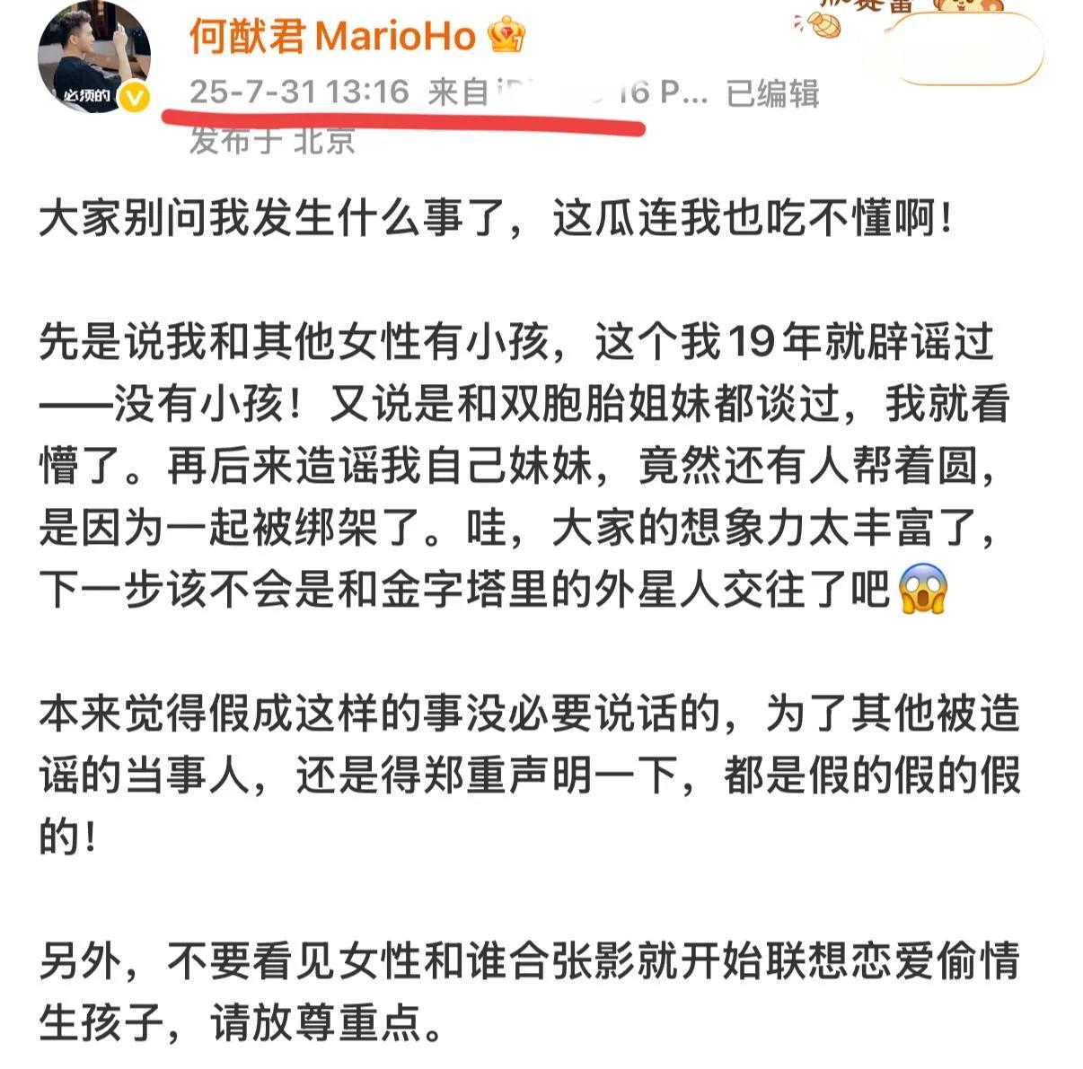 急得都坐不住了,瓜主何猷君出来回应他的大瓜了! 何猷君首先表示这瓜连他自己都吃不懂!只能说网友们想象力太丰富了,简直有点无事生非了! 我吃了一天瓜了,其他的不知道,就觉得和自己亲妹妹拍个并没有很亲热,并且妹妹还裹得很严实的,所谓在一起睡的照片,就说两个之间有啥,感觉就有点扯呀。真有啥会发出来让大家看嘛,所以还是散了吧! 我真的感觉跟他妹妹那个瓜传得太离谱,如果是真的,他不可能找个有名气的人结婚,一旦暴雷根本就停不住。