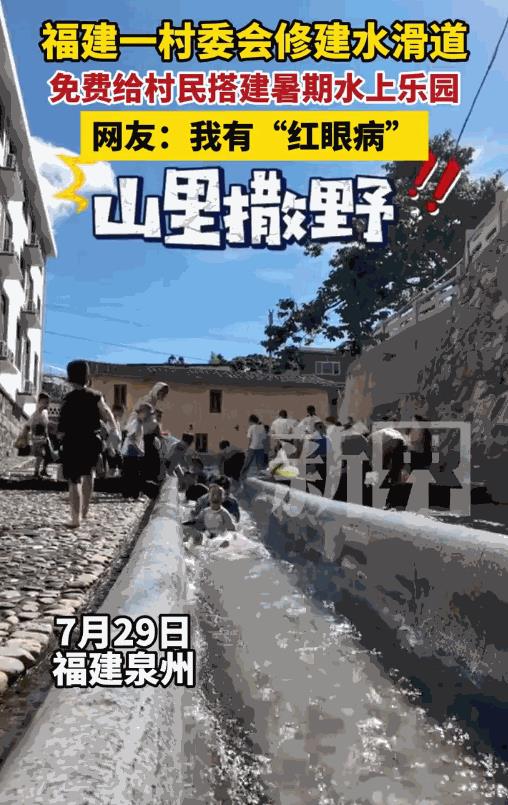 “这村子火了!”7月29日,福建泉州,一村子为了吸引游客,在村中修建水滑道,最关