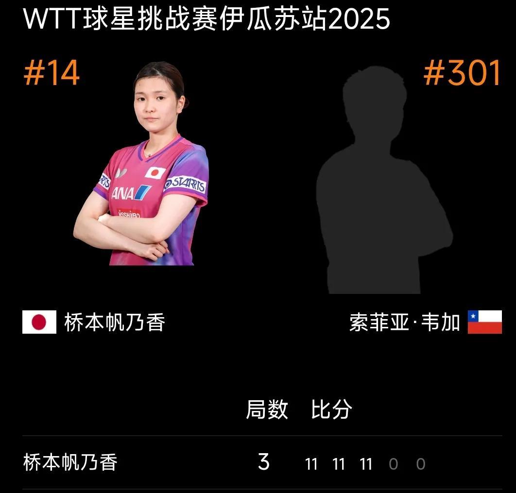 桥本帆乃香晋级女单16强! #WTT伊瓜苏球星挑战赛# 女单第二轮比赛进行中,日本选手桥本帆乃香在与智利选手索菲亚.韦加对阵中以大比分3比0轻松胜出晋级16强,桥本帆乃香是削球手,韦加基本判断不潜桥本帆乃香削过来的球什么旋转,没什么回合,比分差较大,韦加三局总共才赢10分!桥本帆乃香在八分之一决赛对阵曾尖,曾尖3比0战胜了伊莎贝尔已晋级! #头号创作者激励计划#