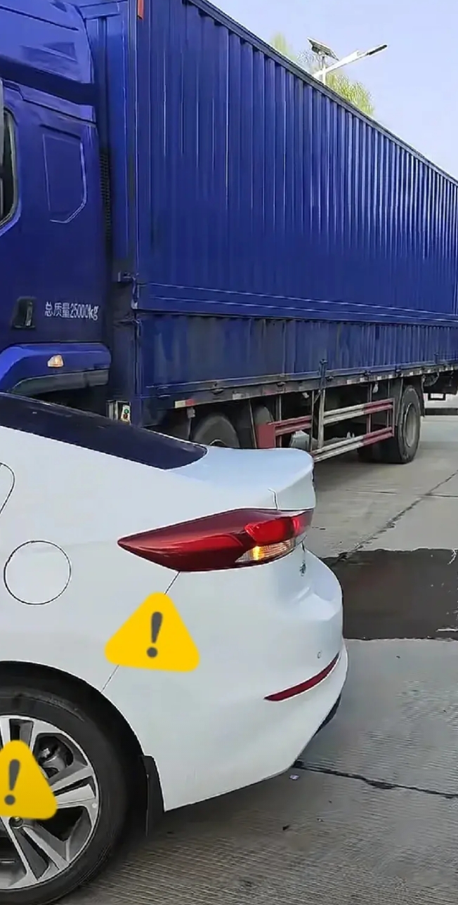 其实是卡车提前很多刹车所以小车才没有辗压小车。正常是卡车压在小车上面