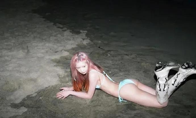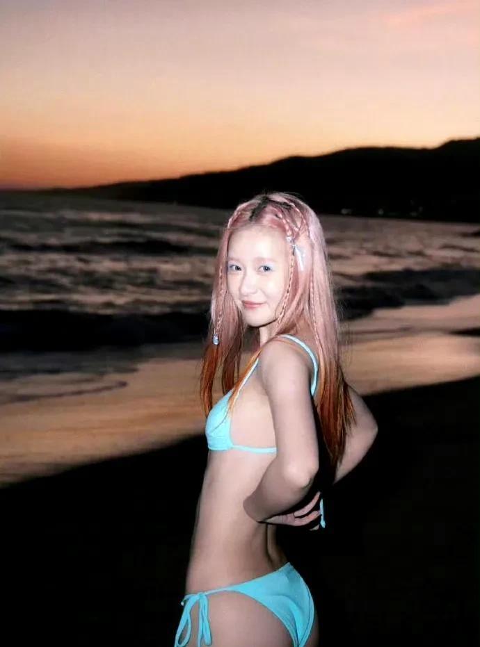徐娇海边造型大变身!淡蓝比基尼勾勒出曼妙身姿,粉发俏皮又吸睛,或趴或坐间,