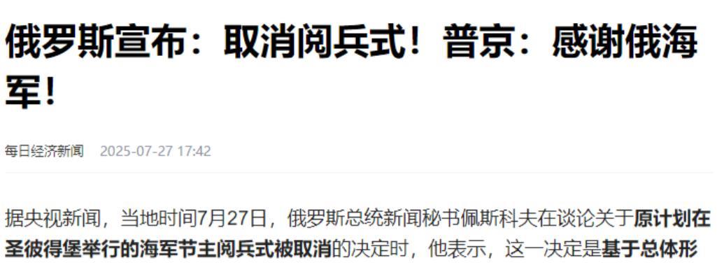 还没登机访华,普京突然叫停阅兵,话音刚落,中方对乌发严厉警告…… 大家怎么看,可以评论区一起唠唠! 7月底,克里姆林宫突然甩出个重磅消息:原定27日的海军阅兵取消了,这消息来得太突然,以至于全球媒体都没反应过来。 其实这事儿说来也怪,往年的海军节,那可是俄罗斯的重头戏,军舰排排站,导弹亮闪闪,普京站在观礼台上,那气派,那排场,那是实打实的“秀肌肉”现场。 可今年,就在普京准备访华的节骨眼上,这么重要的仪式说停就停了。 官方给的理由是“安全考虑”,可明眼人都知道,这是俄军在黑海吃了大亏的无奈之举。 想想也是,你家的主力舰都让人家用无人机炸得七零八落,这时候摆阅兵,不是自找难堪吗? 网友们也调侃:“这不是怕丢人嘛,军舰都成潜水艇了,还阅什么兵?” 确实,光是2023年,俄罗斯黑海舰队就损失了五分之一的大型舰艇,连旗舰都沉了,这阅兵要是硬着头皮搞,那真成了“阅尽沧桑”了。 更有意思的是,就在俄罗斯这边刚宣布取消阅兵,中国那边就对乌克兰放了个大招。 原来乌克兰不知道抽什么风,突然宣布制裁53个中国实体,说是这些企业支持俄罗斯军工,这下可捅了马蜂窝,中国外交部立马火力全开,要求乌克兰立即纠正错误。 这两件事凑在一起,时间点卡得堪称绝妙,一个在访华前低调收场,一个对乌克兰亮出獠牙,看似不相干的两件事,却在国际博弈中画出了一个耐人寻味的问号。 当然,这事儿远没有表面看起来那么简单,普京取消阅兵,与其说是怕露怯,不如说是打出了一张“以退为进”的牌。 毕竟现在的国际舞台上,真刀真枪的较量远比表面的排场更有分量。 这出戏的后半场更有看头,普京不搞阅兵了,转而去视察了“七月风暴”海军演习,还宣布要把五个海军陆战旅扩编成师。 这操作很有意思,不在涅瓦河秀肌肉,改在实战中练硬功,这转身可谓漂亮。 而中国这边的反击更是干脆利落。 要知道,乌克兰这些年可没少从中国这边拿援助,现在突然来这一出,不就是典型的过河拆桥吗?外交部的回应可谓是字字带火:无理制裁,立即纠正,不然后果自负。 有网友评论说:“这是乌克兰给美国递投名状,结果踢到了铁板上。” 讲真的,乌克兰这波操作不但没讨到好,反而把自己推到了更尴尬的境地,毕竟在当前的国际形势下,谁还敢轻易得罪中国这个经济大国? 更有趣的是网络上的各种解读,有人说这是“一个秀实力,一个秀态度”,也有人调侃“普京取消阅兵省下的钱,正好可以订购更多中国商品”。 不过玩笑归玩笑,这事儿的确暴露了当前国际局势的微妙变化。 最后这事儿为啥会这么发展?说白了就是国际形势逼的。 俄罗斯现在需要实力而不是面子,中国则需要让世界知道,谁想借机挑衅,门都没有,一个收缩战略重心,一个坚决捍卫利益,这俩事儿凑一块,算是给国际社会上了一课,在这个实力说话的时代,光靠表面功夫可不行。 不过话说回来,这事儿也让人看清了一个事实,现在的国际舞台,比的不是谁嗓门大,而是谁能沉得住气,打得好算盘。 而这次咱们的操作,就是在用实际行动告诉大家,要玩就玩真的,别整那些虚的。 对此,大家有什么想说的呢?欢迎在评论区踊跃留言!麻烦看官老爷们阅读后点赞关注,谢谢!