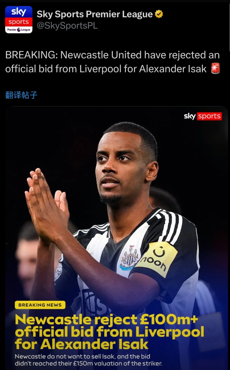 天空体育的消息: 纽卡拒绝了利物浦的1亿英镑伊萨克报价,认为对方缺乏诚意,都