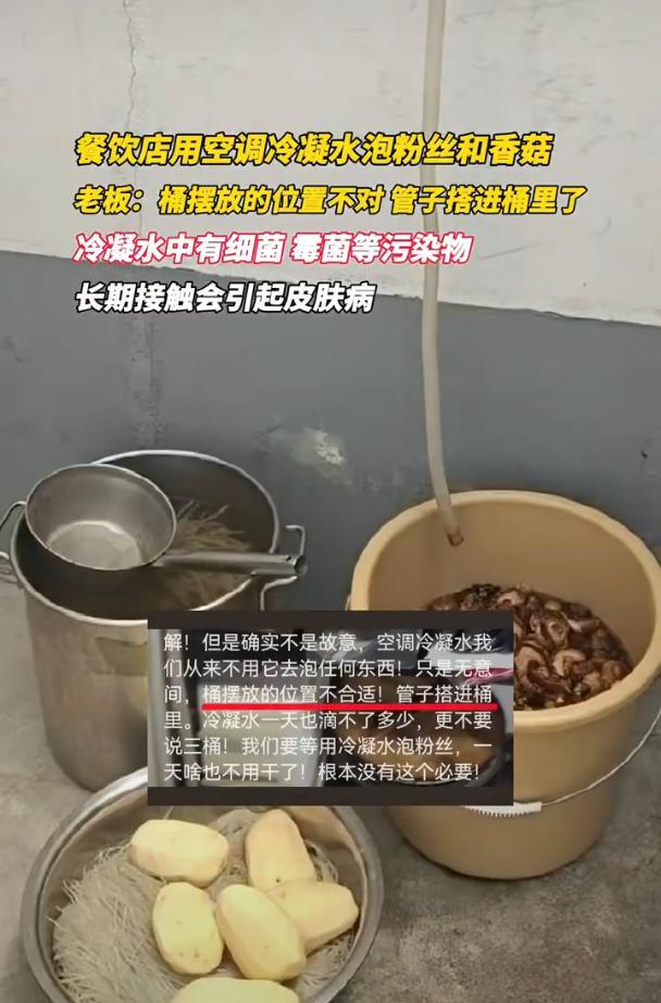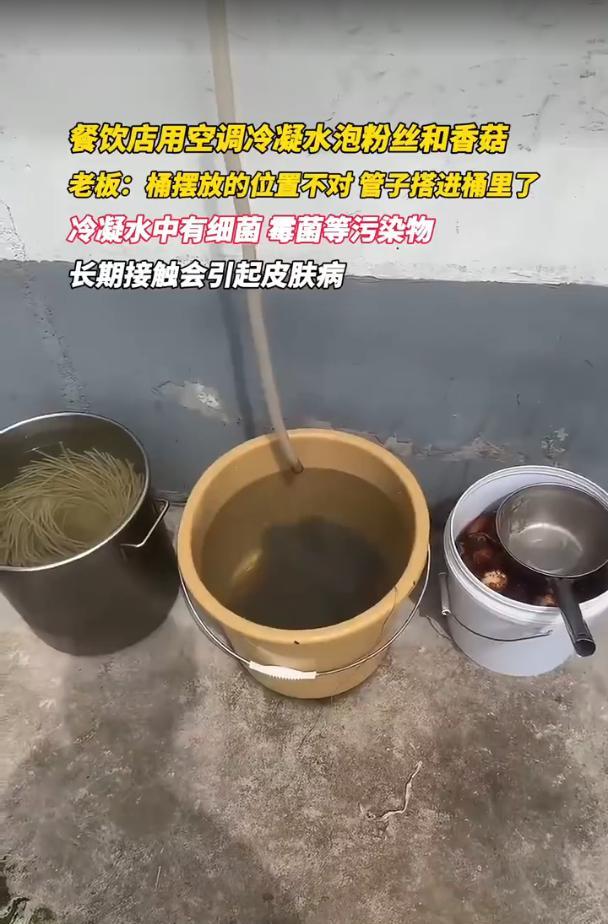 “太缺德了!”7月30日,江苏连云港,网友外出时,发现一根从饭店墙内导出的管子,正在往一个桶内持续滴水,而桶两旁装有正在泡发的食材!怀疑饭店在用空调冷凝水泡发食材,网友便将饭店给举报了,经有关部门调查,举报内容基本属实。 如今,外卖行业已经发展的很成熟,人们足不出户就能品尝到美食,然而,有一些利欲熏心的商家,为了多赚些钱,竟然昧着良心使用有问题的食材,成本能省一点是一点,对消费者的健康置若罔闻。 这天,网友发现一家饭店似乎在用空调冷凝水泡发食材,只见一根长长的管子从屋内导出,正源源不断的朝桶里滴着水。这根管子网友看着眼熟,和自家空调的排水管一模一样,一个恐怖的猜测在脑海中浮起。 随即,网友对该饭店进行了举报,工作人员很快上门调查,发现这是一家只做外卖的饭店,而桶内泡发食材的水确实是冷凝水。 对此,饭店老板还打算狡辩,称是桶的位置摆错了,不知道管子什么时候掉进了桶里。 最终有关部门要求该饭店停业整顿。 空调冷凝水中还有大量杂质、细菌,虽然PH值接近中性,但并不适合饮用和做饭,不过用来浇花倒是没问题。 大家对于这件事是怎么看? 信息来源:《官方通报“江苏一餐饮店用空调冷凝水泡发粉丝”:基本属实,已停业整顿》观海新闻