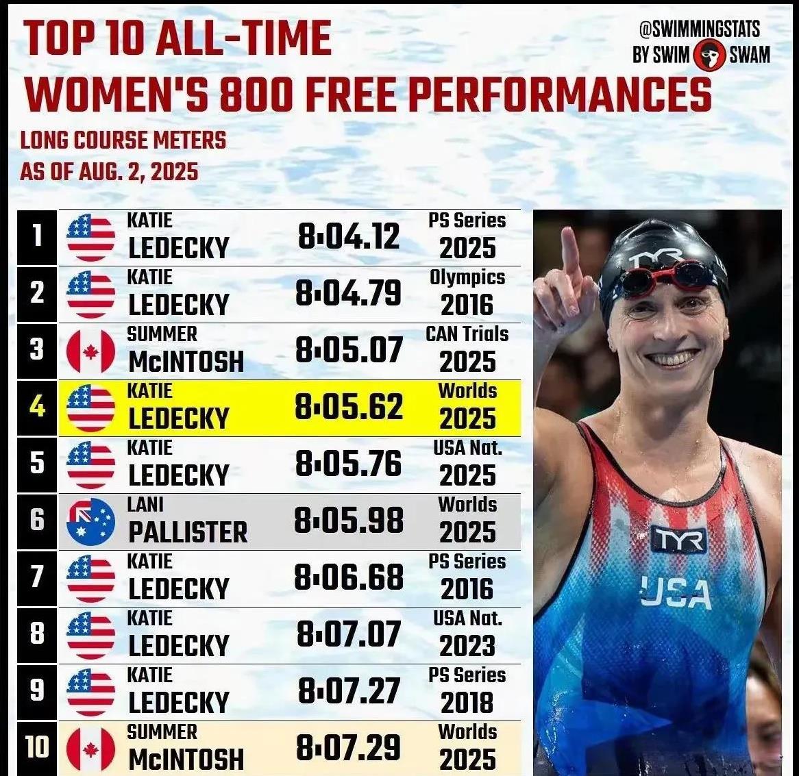 不得不服,莱德基就是历史上最伟大的女游泳运动员! 800米自由泳历史前十的成绩中