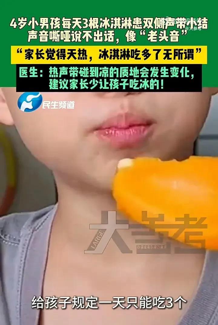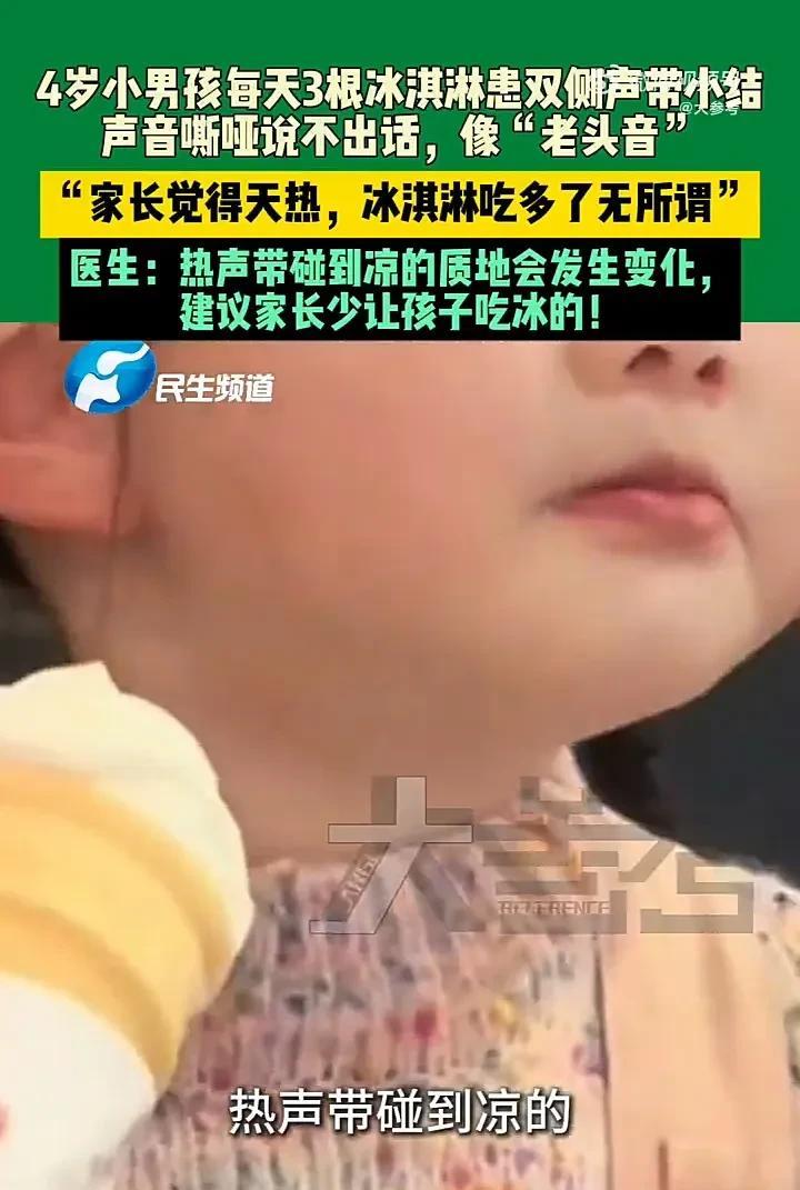 家里有孩子的必须注意!近日,河南郑州一个4岁男孩突然失声,声音嘶哑说不清楚话,家长不知所措,赶紧带男孩到医院检查,结果得知是因为家长每天允许男孩吃三根冰淇淋,导致双侧声带小结,冷刺激让男孩的声带发生质地突变。