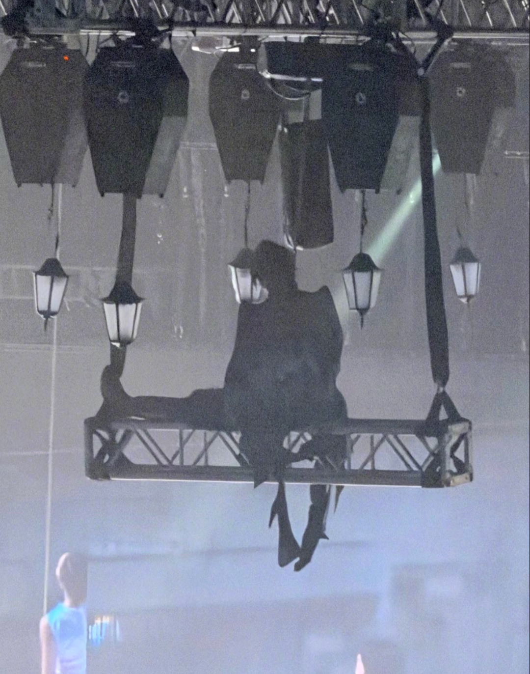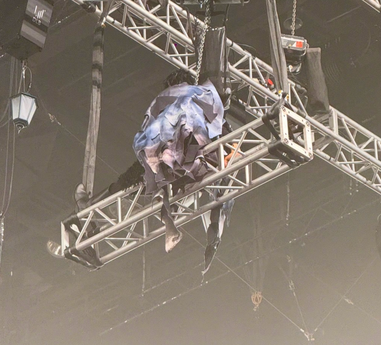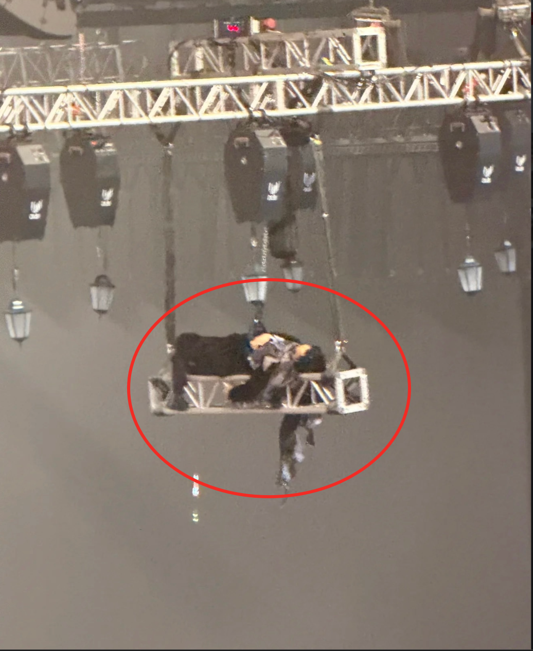 原定从高空降落的峰哥被迫滞留离地约20米的钢架结构(Truss架)上,全程无法移动,直至演唱会结束(约3小时后)才被安全降下。