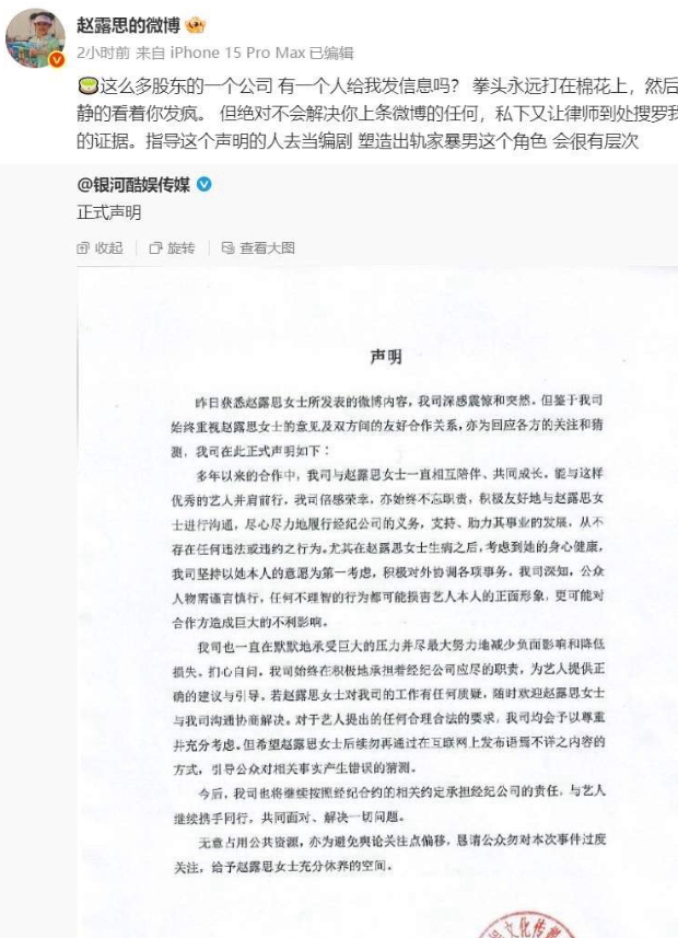 继续履行合约,不会和艺人解约,想靠舆论离开公司,没门儿。