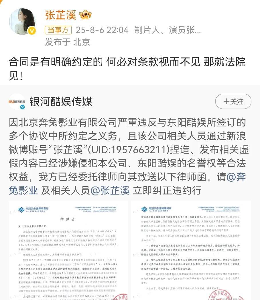 事态升级,银河酷娱把张芷溪给告了, 银河酷娱出品的《献鱼》官宣定档,张芷溪对银河发难。 说好的让赵露思没演就算了。 她所在的奔兔影业从出品方变成了联合出品。 她发出来没多久银河就开始给她发律师函了,张芷溪态度也很硬,有合同,既然违约那就法院见。 这事赵露思就没啥关系了。