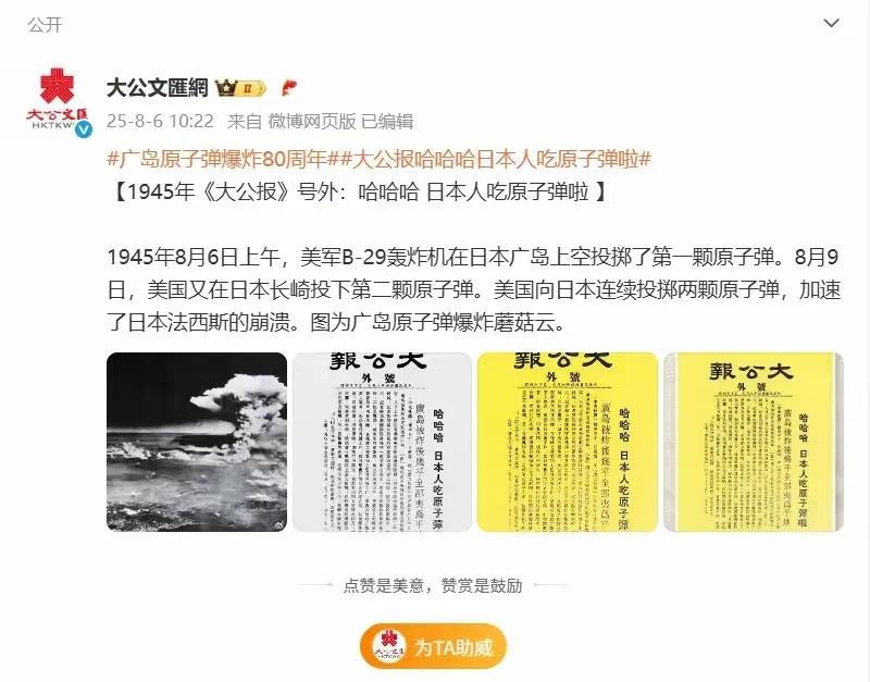 1945年8月6的大公报:哈哈哈,日本吃原子弹了。 划重点,这个“吃”字用的好,期末要考。
