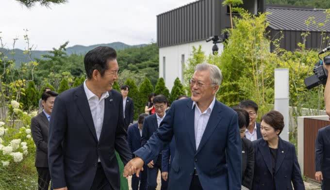 韩国媒体消息,共同民主党代表郑清来7日首次以代表身份到访庆尚南道金海市峰下村