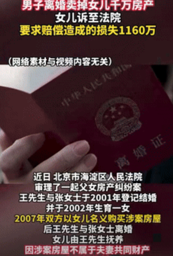 “算盘打得真响!”北京,一对夫妻合伙买了一套房子,当时写的是女儿的名字,后来两人离婚后,王先生争到了女儿的抚养权,房子也暂时由他管理,不料男子代替女儿和自己签订了房屋赠与合同,偷偷将房子卖了1160万元,成年后的女儿知道后,认为侵犯了自己的利益,将男子告上法庭,法院是这么判的!