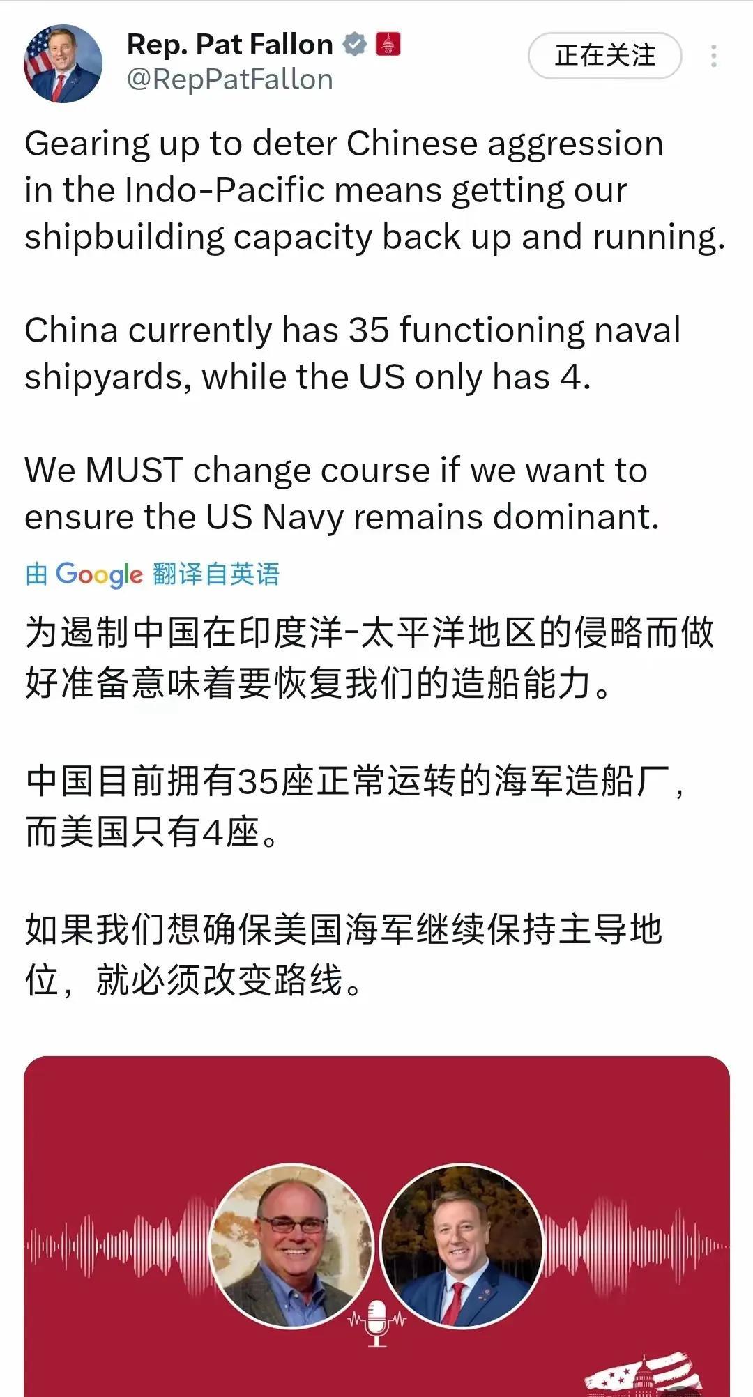 美国众议院军事委员会成员帕特·法伦8月9日焦虑地叫嚣道:“为遏制中国在印度洋-太平洋地区的侵略而做好准备意味着要恢复我们的造船能力。中国目前拥有35座正常运转的海军造船厂,而美国只有4座。如果我们想确保美国海军继续保持主导地位,就必须改变路线。” 说两点: 二,中国有35座造船厂美国有4座,相差近9倍,但只是数量差距吗?没有造舰能力和效率上的差距吗?美海军早已评估过的结果显示,美国造舰能力和效率的综合效率,跟中国有230倍的差距,这差距是帕特·法伦这样的几个小丑扯着脖子叫嚣几声就可以恢复的? 帕特·法伦的焦虑是美国所有政客的焦虑,我们也骄傲地理解他们的焦虑,但美国政客们靠给中国捏造罪名以及歇斯底里的叫嚣,恢复不了美国的造舰能力,也不会使焦虑消失,如果焦虑是一种病,相反还会加重病情,成为有传染性的瘟疫。