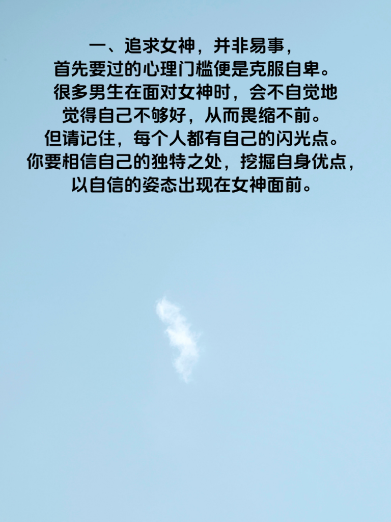 一、追求女神,并非易事,首先要过的心理门槛便是克服自卑。很多男生在面对女神时,会不自觉地觉得自己不够好,从而畏缩不前。但请记住,每个人都有自己的闪光点。你要相信自己的独特之处,挖掘自身优点,以自信的姿态出现在女神面前。 二、再者,要摒弃患得患失的心态。不要总是担心她会不会拒绝你,会不会不喜欢自己。过度的担忧只会让你在追求过程中表现得小心翼翼,失去很多机会。大胆去表达你的心意,勇敢地迈出每一步。即使结果不尽如人意,至少你努力过,不会留下遗憾。 三、还有,要保持真诚。女神们往往能敏锐地察觉到你的真心与否。用真诚去对待她,关心她的生活、倾听她的想法。不做作,不虚伪,让她感受到你是真正在乎她,而不是只图一时的新鲜感。只有过了这些心理门槛,你在追求女神的道路上才能更加顺畅,离收获爱情也会更近一步。