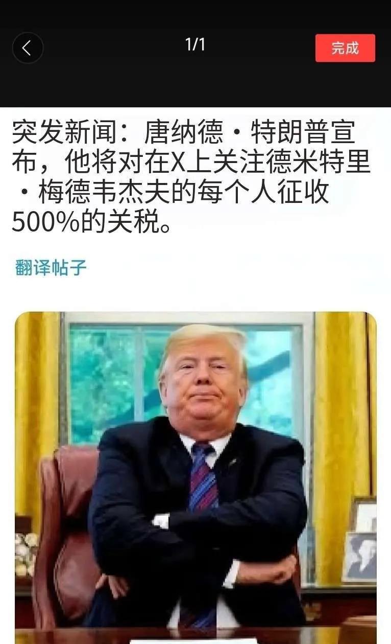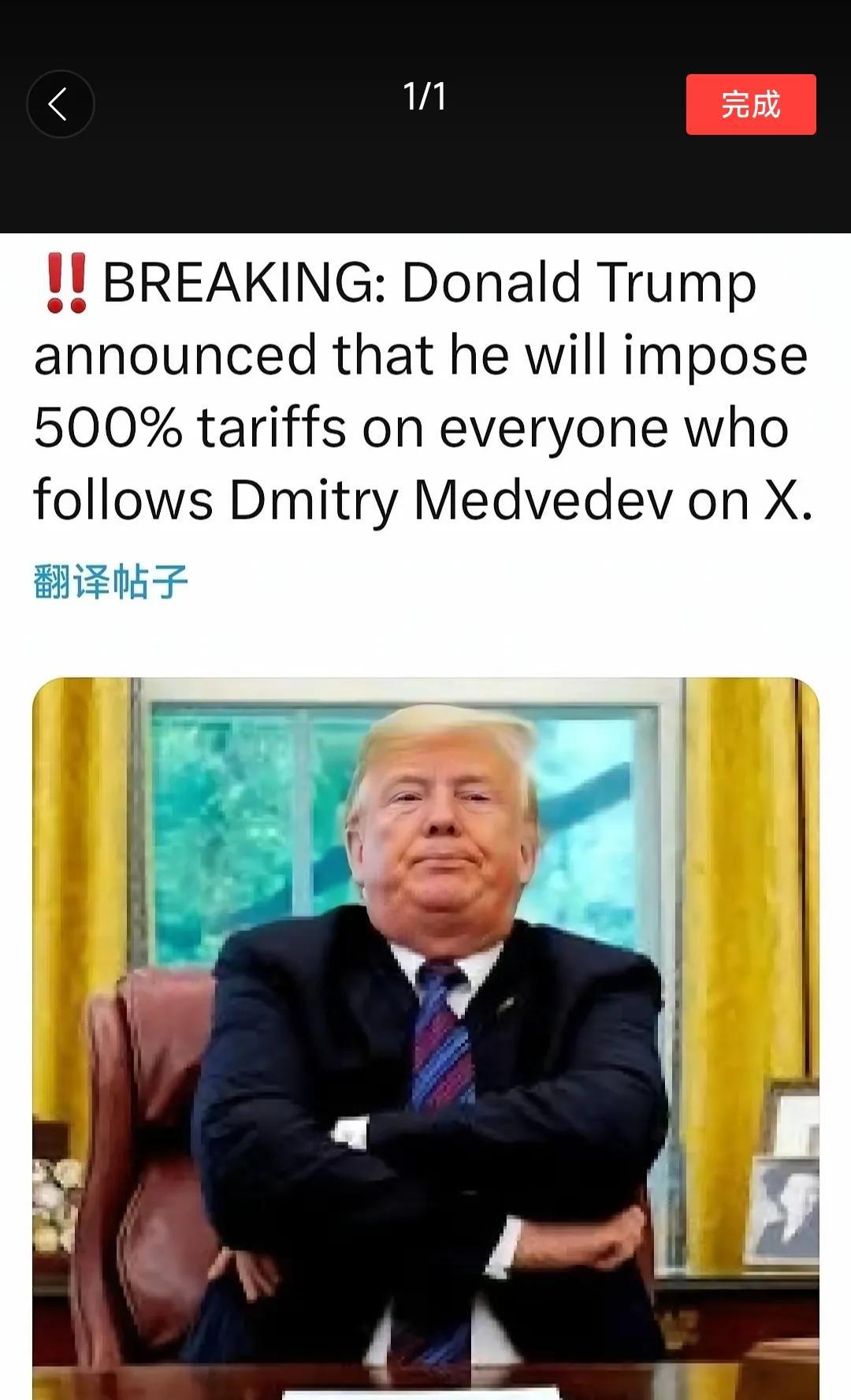 关税也可以这样玩?美国总统唐纳德·特朗普8月5日宣布,他将对所有在社交媒体平台上关注德米特里·梅德韦杰夫的人征收 500% 的关税。 就因为梅德韦杰夫声称手里也有和摩萨德一样的特朗普在萝莉岛的视频引发了众多关注使特朗普感受到威胁,于是就孩子气地对关注梅德韦杰夫的人征收500%的关税。 特朗普这种把国家关税当成他用于对某一个人惩罚的个人工具,让关税失去了本来的属性和重要性,闻所未闻,他把关税玩到了一个崭新高度,这种公权私用是拉低了还是拉高了关税的地位?特朗普全然不顾,只要能满足自己的任性和能让梅德韦杰夫说的有关他的事不被人知道就行。 特朗普能如此随意滥用关税说明,他已经信马由缰,自我放飞,成为一个失去自我控住,恣意妄为无法无天的人。大才。